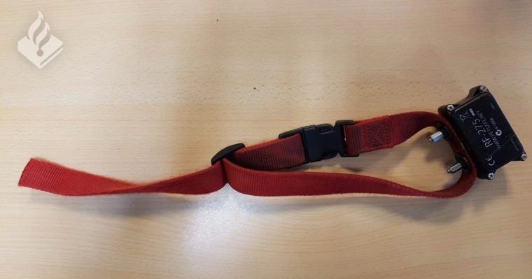Qua formaat hond moet gedacht worden aan een middel/grote hond. De rode halsband die achter bleef is een zogenaamde petsafe band. Een halsband met hieraan een kastje dat stroomschokjes af kan geven.