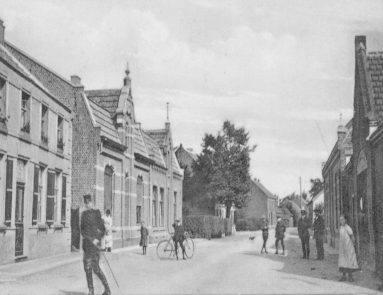 De oude foto, genomen vanaf het huidige horecaplein richting kanaal, zal rond de Eerste Wereldoorlog gemaakt zijn en is dus een eeuw oud. Auto’s waren er in Nederweert nog niet. Er is wel al een fiets te zien, wat dorpsjeugd en een geuniformeerde heer met een degen. Is het een Nederlandse legerofficier of een veldwachter?