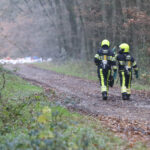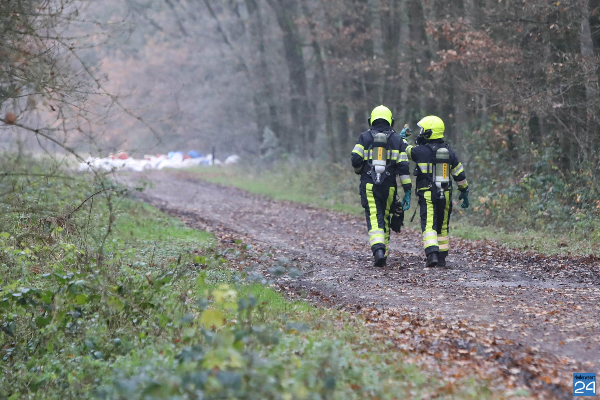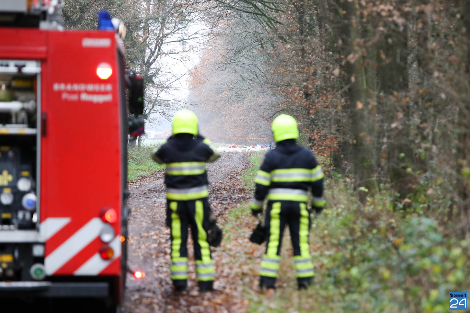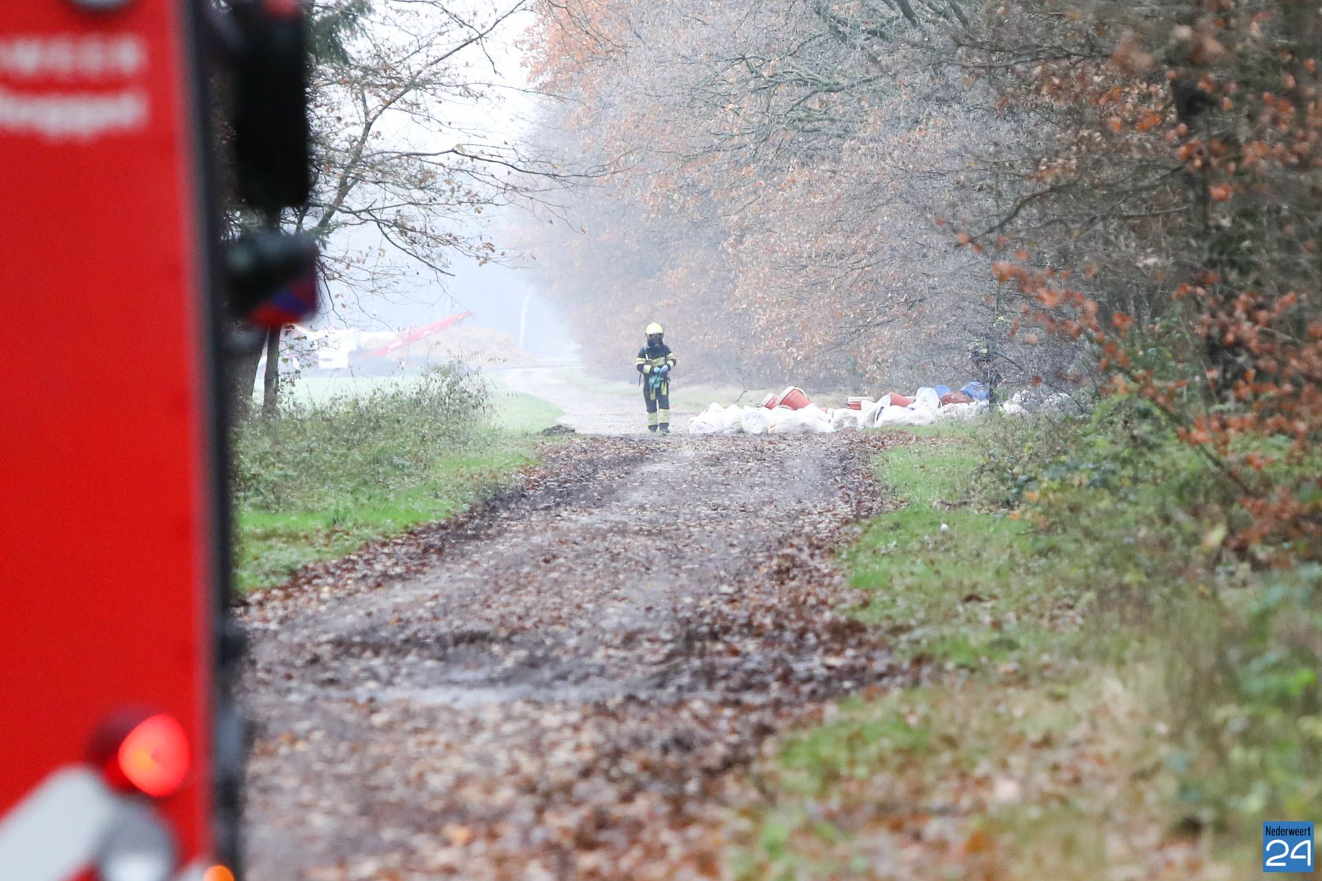 De vaten zijn midden op een zandweg aan de rand van het bos gedumpt. Het gaat volgens de brandweer om ongeveer 20 vaten met vloeistof en een hoeveelheid zakken met poeder. Diverse vaten en zakken lekken.