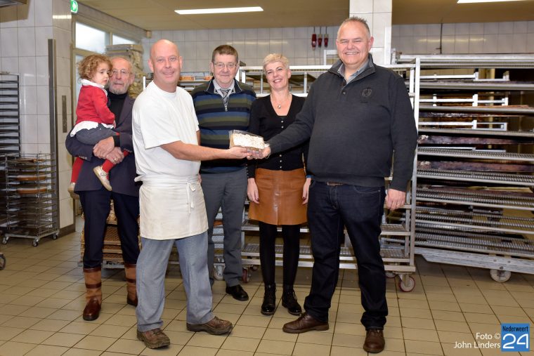 Foto: John Linders | Bakker Peter Kessels overhandigt het eerste steinke aan Antoine Hekers, comitévoorzitter. Verder v.l.n.r. : Sjef Geuns met kleindochter Fien, pastoor André Koumans en Carin Sieben-van den Boogaert.
