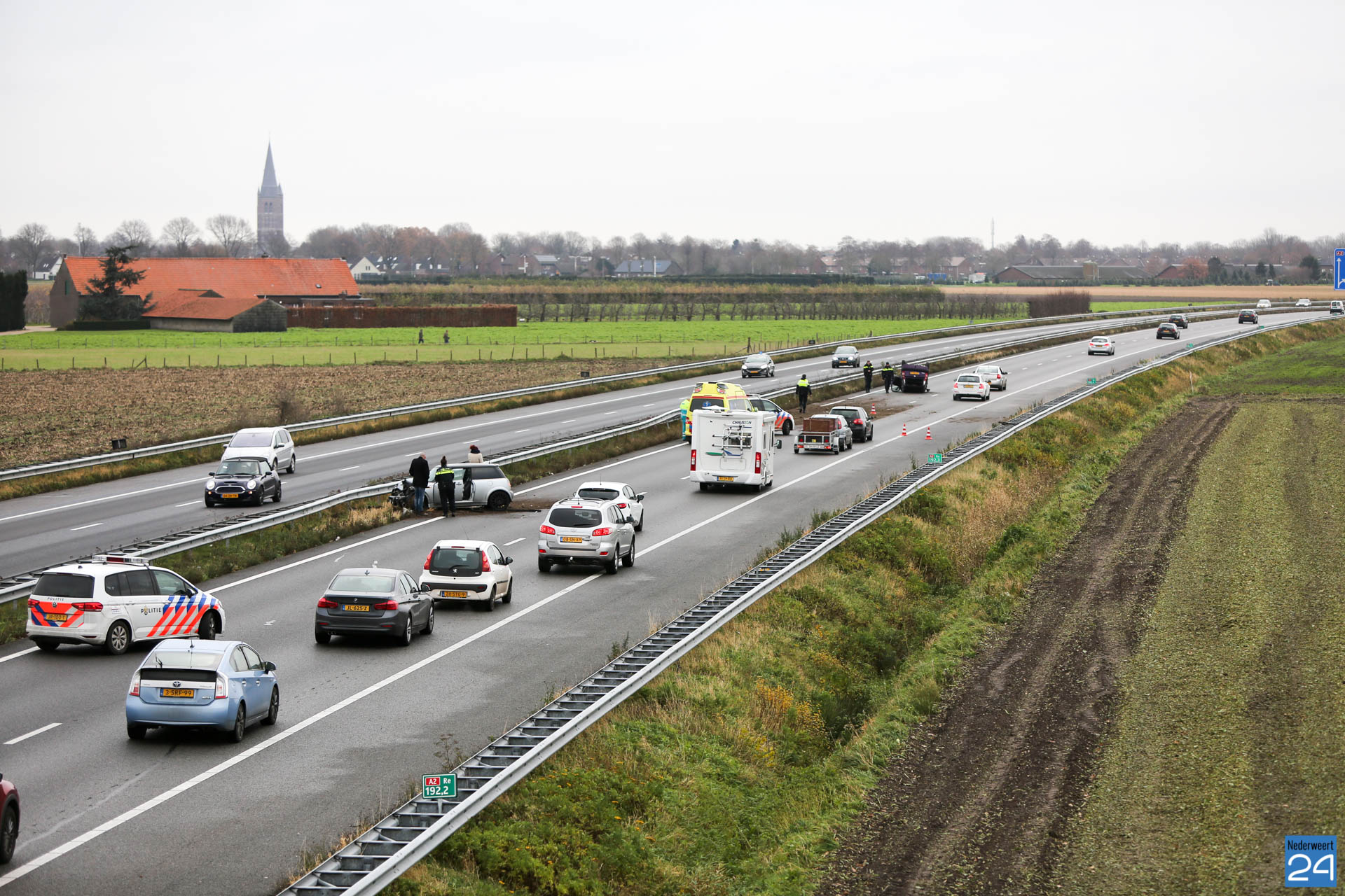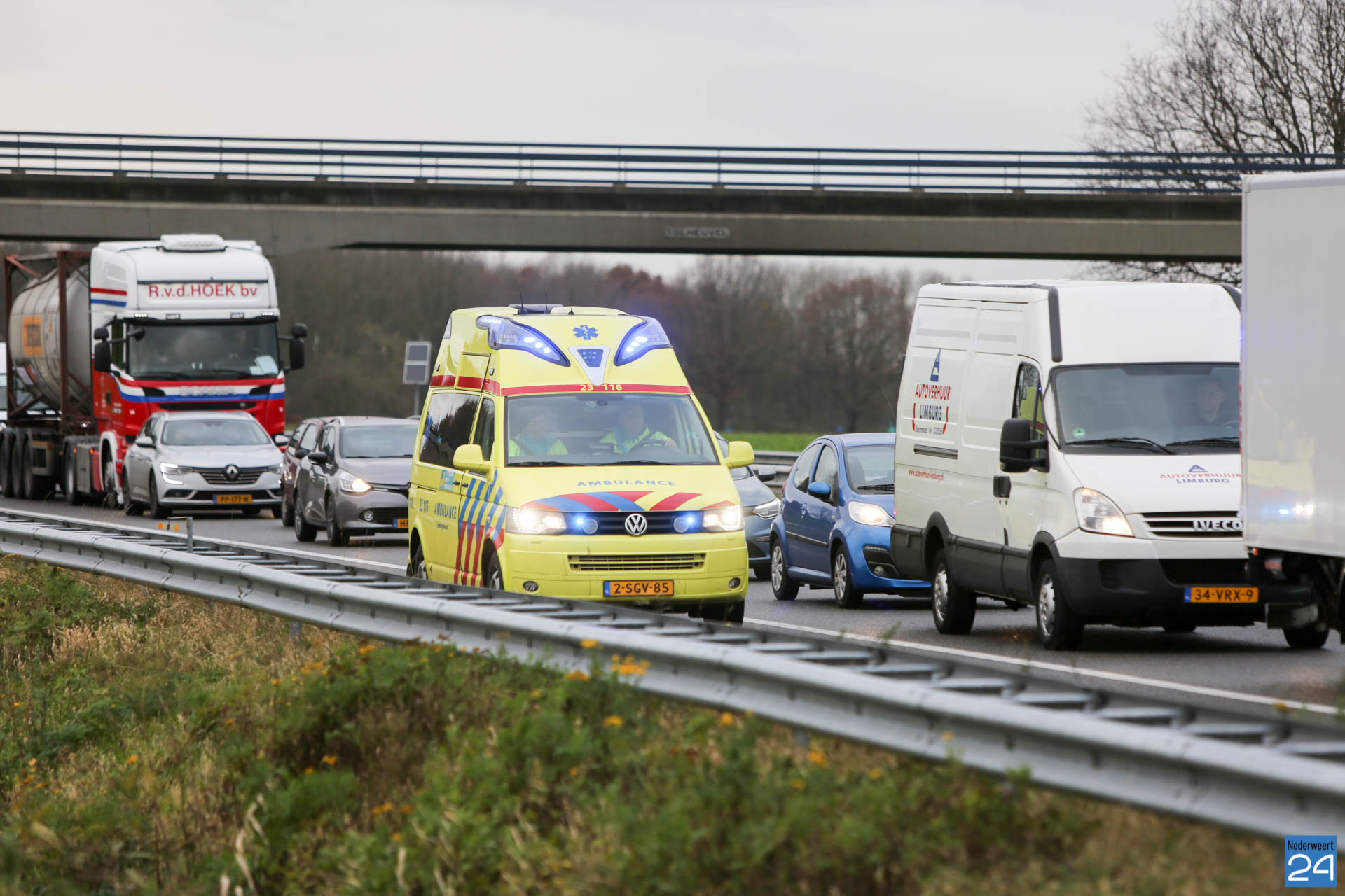 In eerste instantie werden de hulpdiensten massaal opgetrommeld maar dit bleek gelukkig niet nodig. Door het ongeval was de linker rijstrook geblokkeerd met een file van zo’n 4 kilometer als gevolg.
