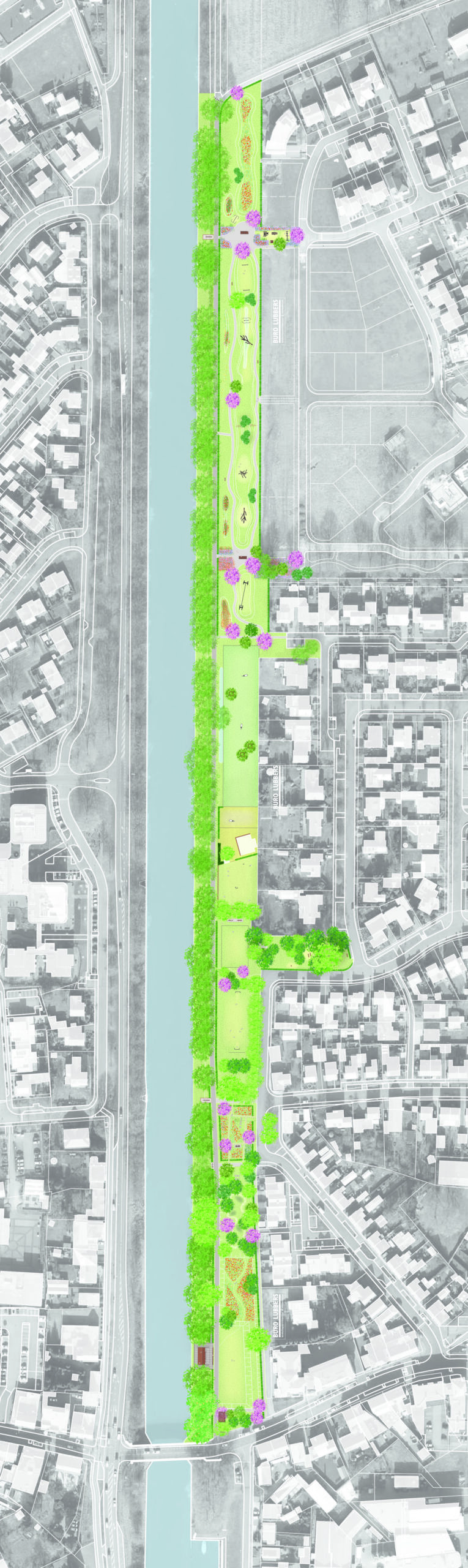 Het park waar in dit ontwerp over wordt gesproken loopt van Brug 15 tot aan de Winnerstraat, ruim 900 meter. Er komt over de gehele lengte een fietspad en er komen “nesten” aan het water met uitzicht over het kanaal. Ook komt er veel beplanting en wordt het park afgewisseld met open en ook meer gesloten delen. Er komt plek voor dieren, en een veldje om bijvoorbeeld te voetballen. Ook de paardenwei krijgt een opknapbeurt die past bij de huisstijl die gekozen is voor het park.