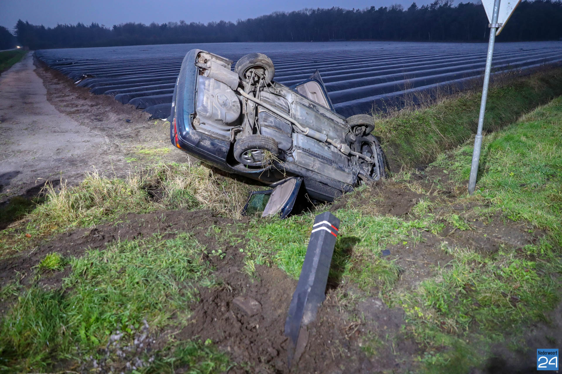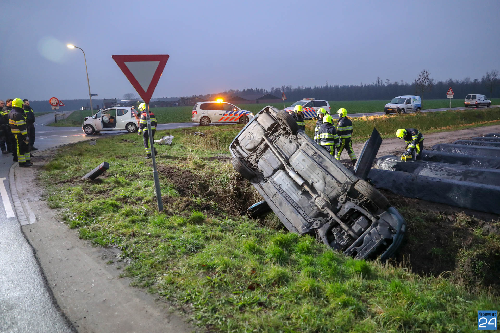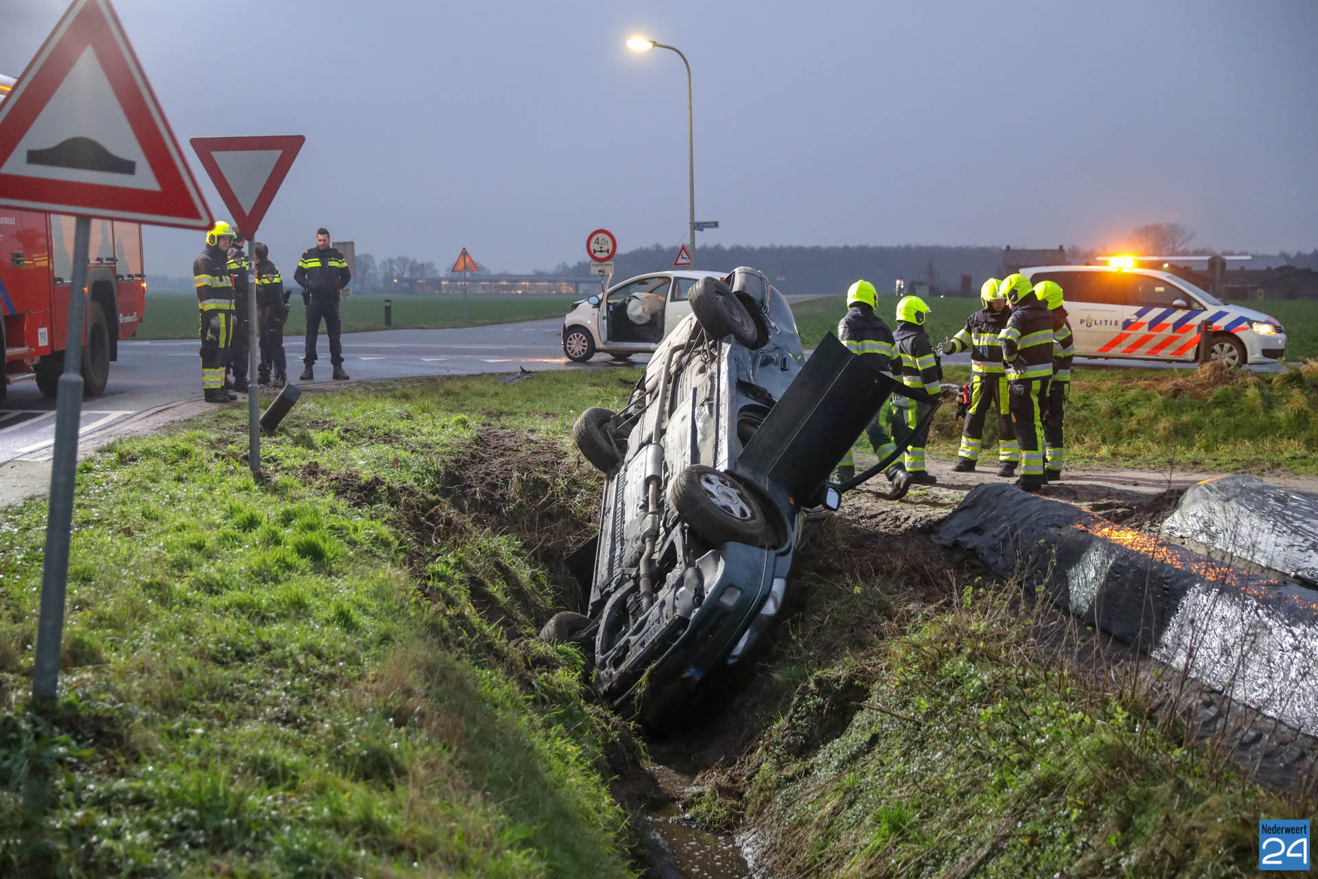 Woensdagmorgen is een personen auto op de Boerderijweg in Heibloem op de kop in de sloot terecht gekomen nadat deze in botsing kwam met een andere personenauto. Het ongeval gebeurde ter hoogte van de kruising Staldijk – Boerderijweg.