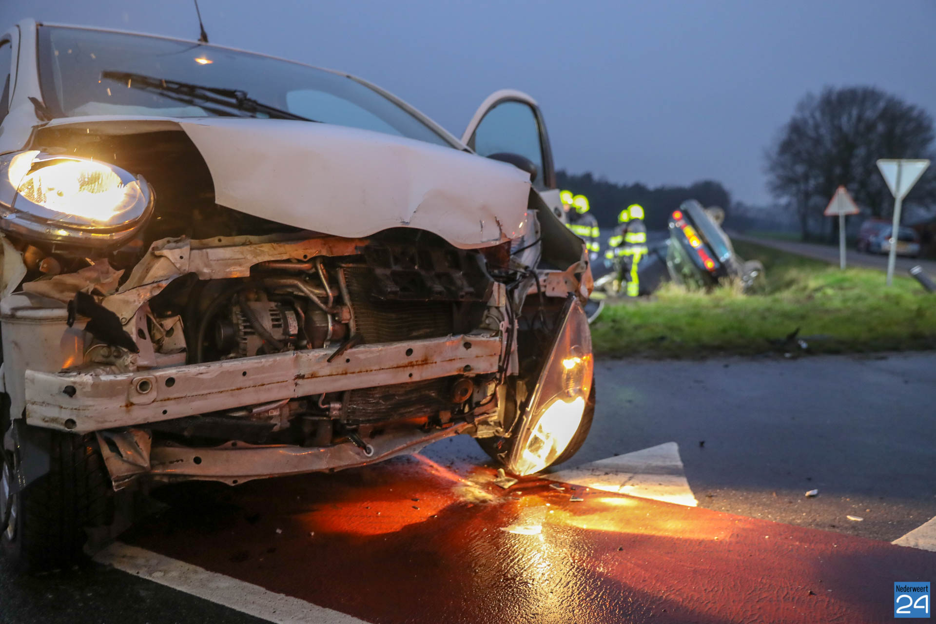 Een auto kwam vanuit de Boerderijweg en heeft waarschijnlijk de andere auto die op de Staldijk reed over het hoofd gezien. De inzittenden, twee jonge meiden, van de auto die op de kop in de sloot terecht kwam zijn nagekeken door het ambulancepersoneel maar kwamen wonder boven wonder met de schrik vrij. Ook de bestuurster van de andere personen auto werd nagekeken en kwam met de schrik vrij.