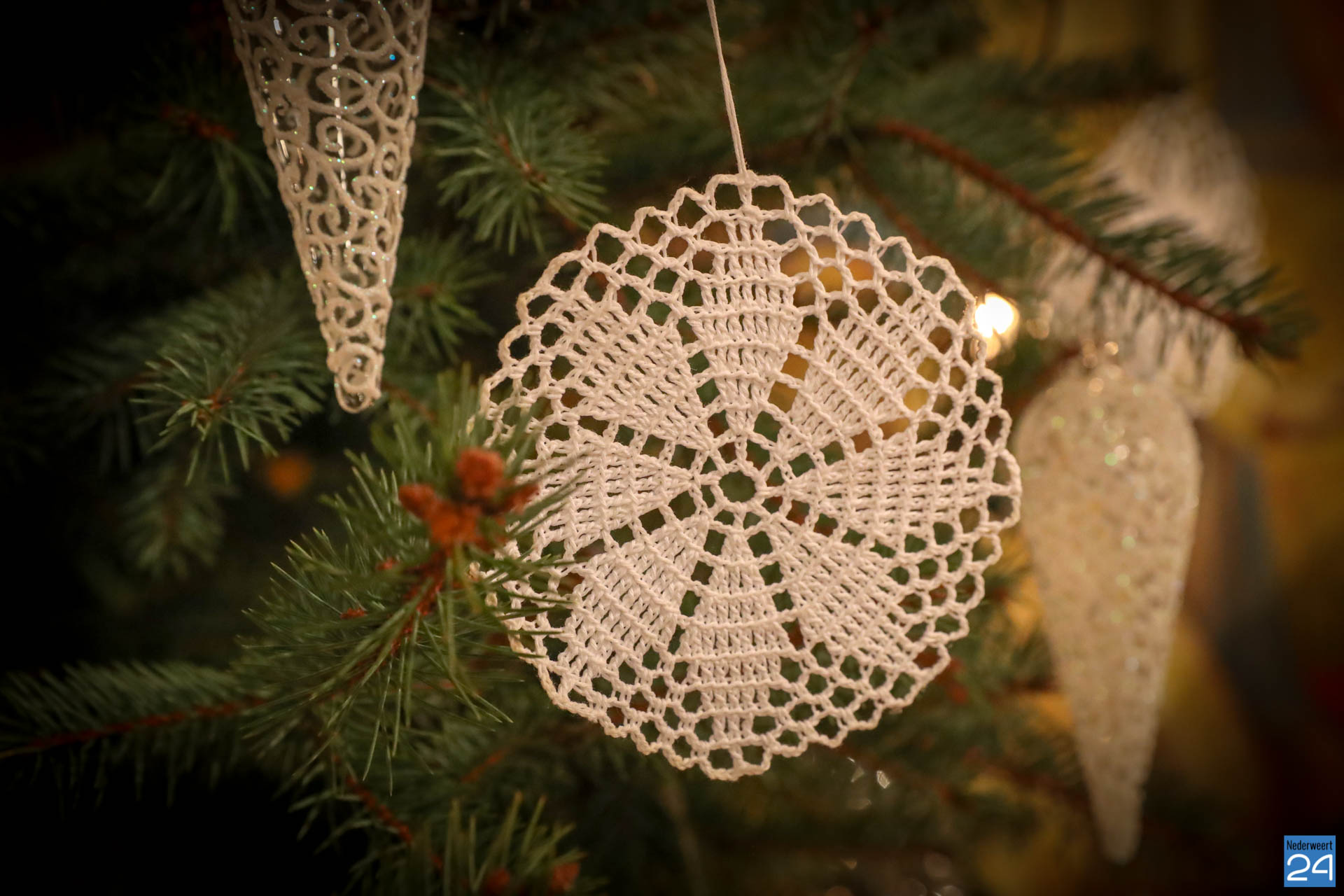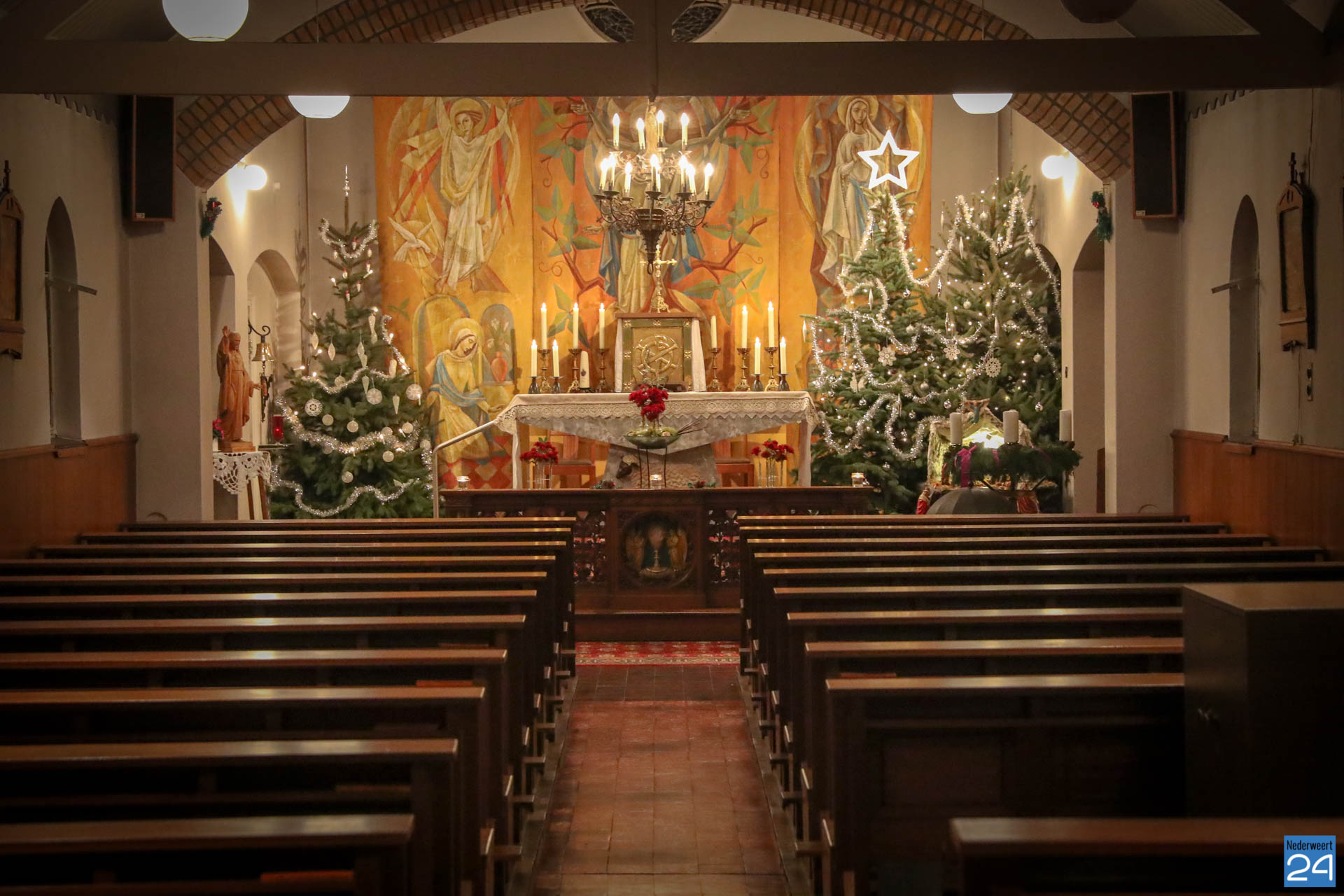 De kerstballen van glas en de zilverkleurige slingers, weerkaatsen de kaarsen die op het altaar branden. Opvallend zijn de gehaakte witte sneeuwsterren, vervaardigd door Mevr. Betje Schroën uit Nederweert-Eind, al ruim 35 jaar lid van het zangkoor. Dit koor zingt elke dienst die erin de kapel wordt verzorgd. Er wordt dus elke keer veel moeite gedaan om de kerkganger zich op zijn gemak te laten voelen.