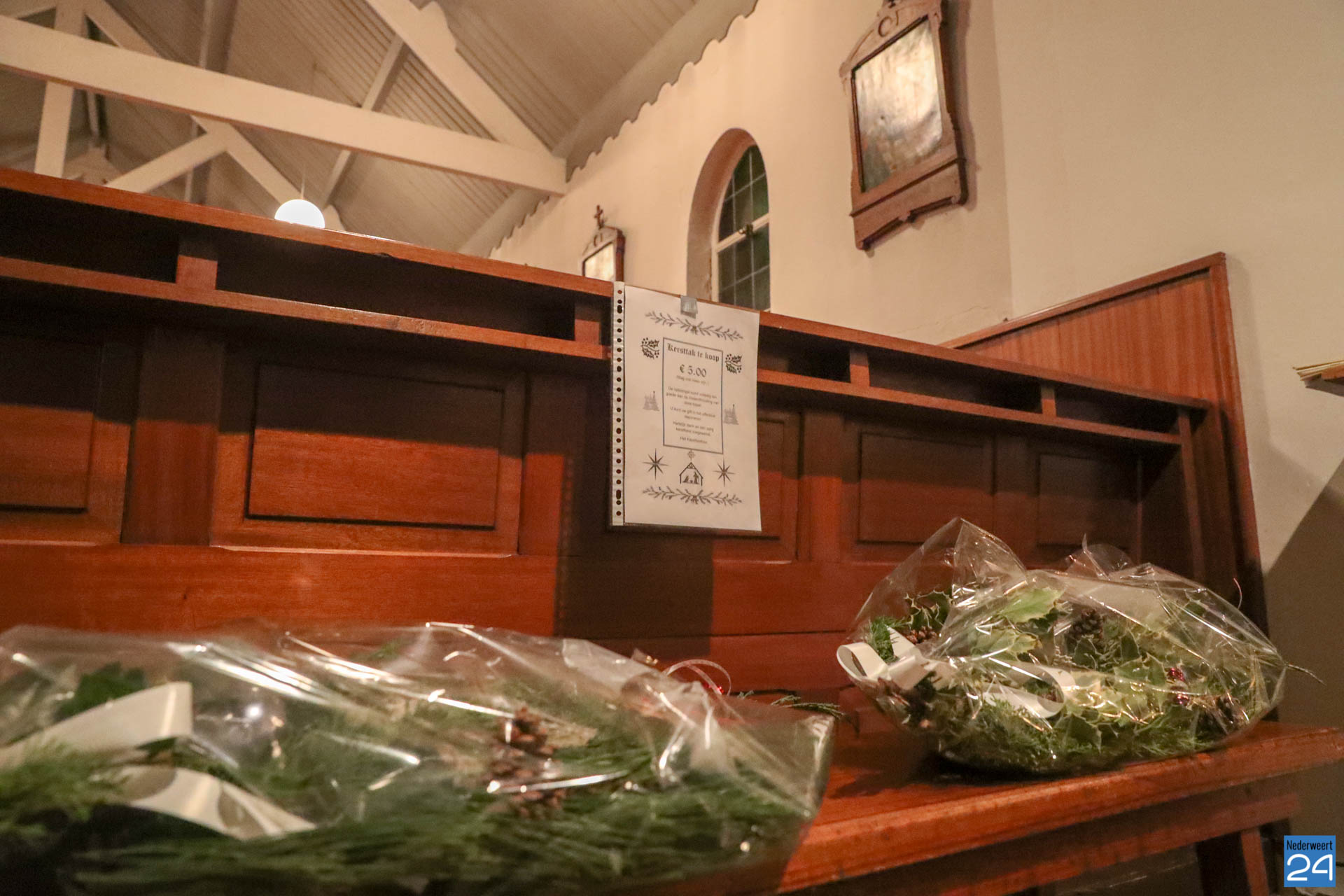 Voor elke kerkgemeenschap is het tegenwoordig moeilijk om de eindjes aan elkaar te knopen. Dit jaar liggen er daarom achter in de kapel, onder het wakend oog van de Heilige Maagd Maria, mooi opgemaakte kersttakken. Ze zijn gemaakt door een paar vrijwilligers en worden te koop aangeboden voor slechts €5.-. Op deze manier wordt er geprobeerd wat geld bij elkaar te sprokkelen voor het onderhoud én behoud van deze kapel.