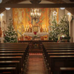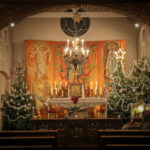 De afgelopen dagen is er door een aantal bestuursleden van de Kapel van Schoor hard gewerkt om de kapel in kerstsfeer te brengen. Wie er naar binnen gaat, zal verrast worden op een prachtig tafereel. Wat het eerst opvalt is de achterwand van het priesterkoor, waar een schildering op jute te bewonderen valt. Dit wandkleed, in 1961 vervaardigd door de bekende Limburgse kunstenaar Cor van Geleuken, komt in de kersttijd nóg beter tot zijn recht door de kerstbomen die aan weerskanten geplaatst zijn.