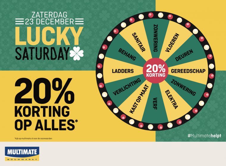 Aanstaande zaterdag 23 december is er weer een Lucky Saturday bij Multimate Heijnen Leveroy. Harrie en Anneleen Heijnen geven dan een korting van 20% op alle artikelen uit de Doe Het Zelf winkel.