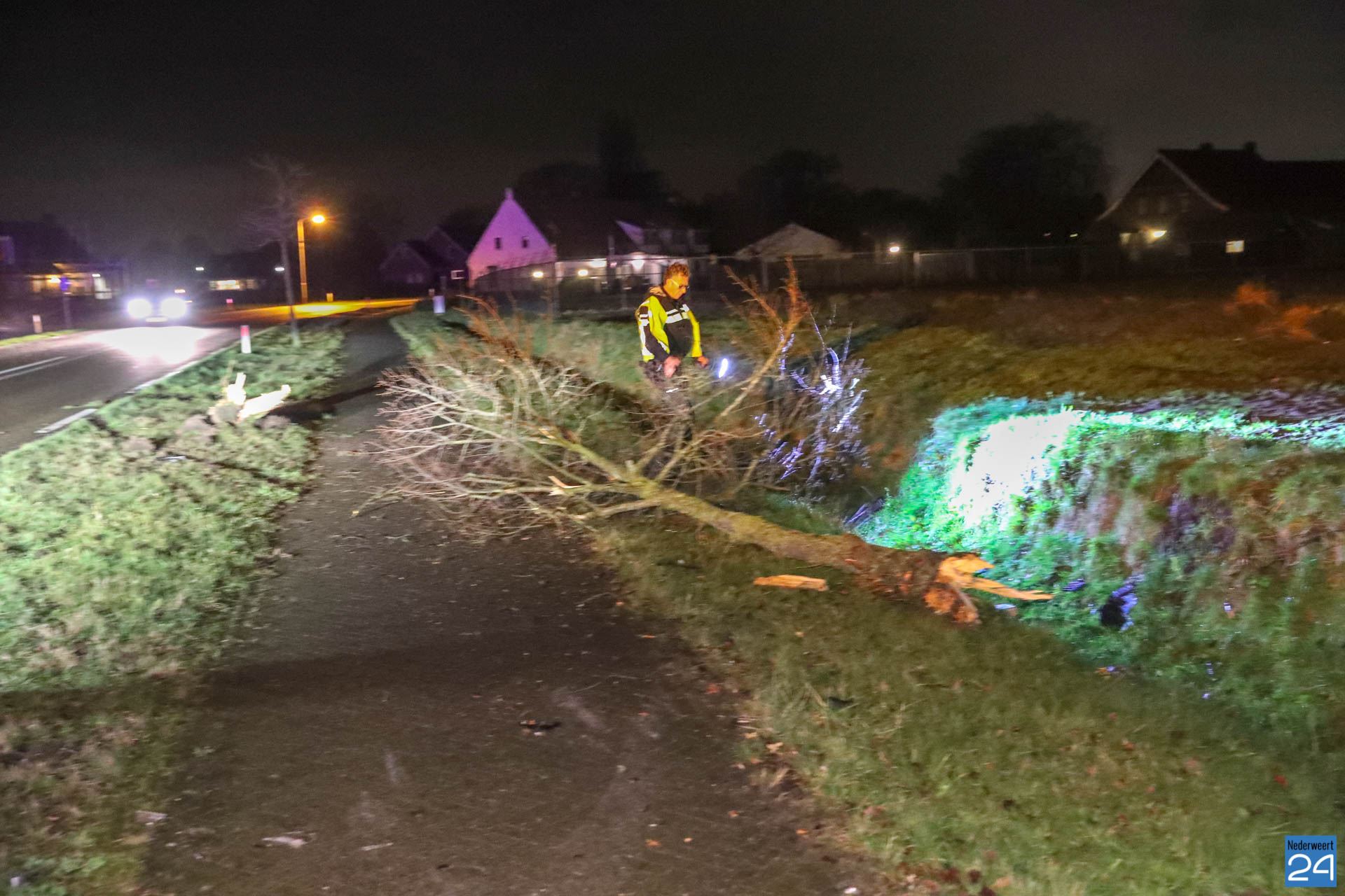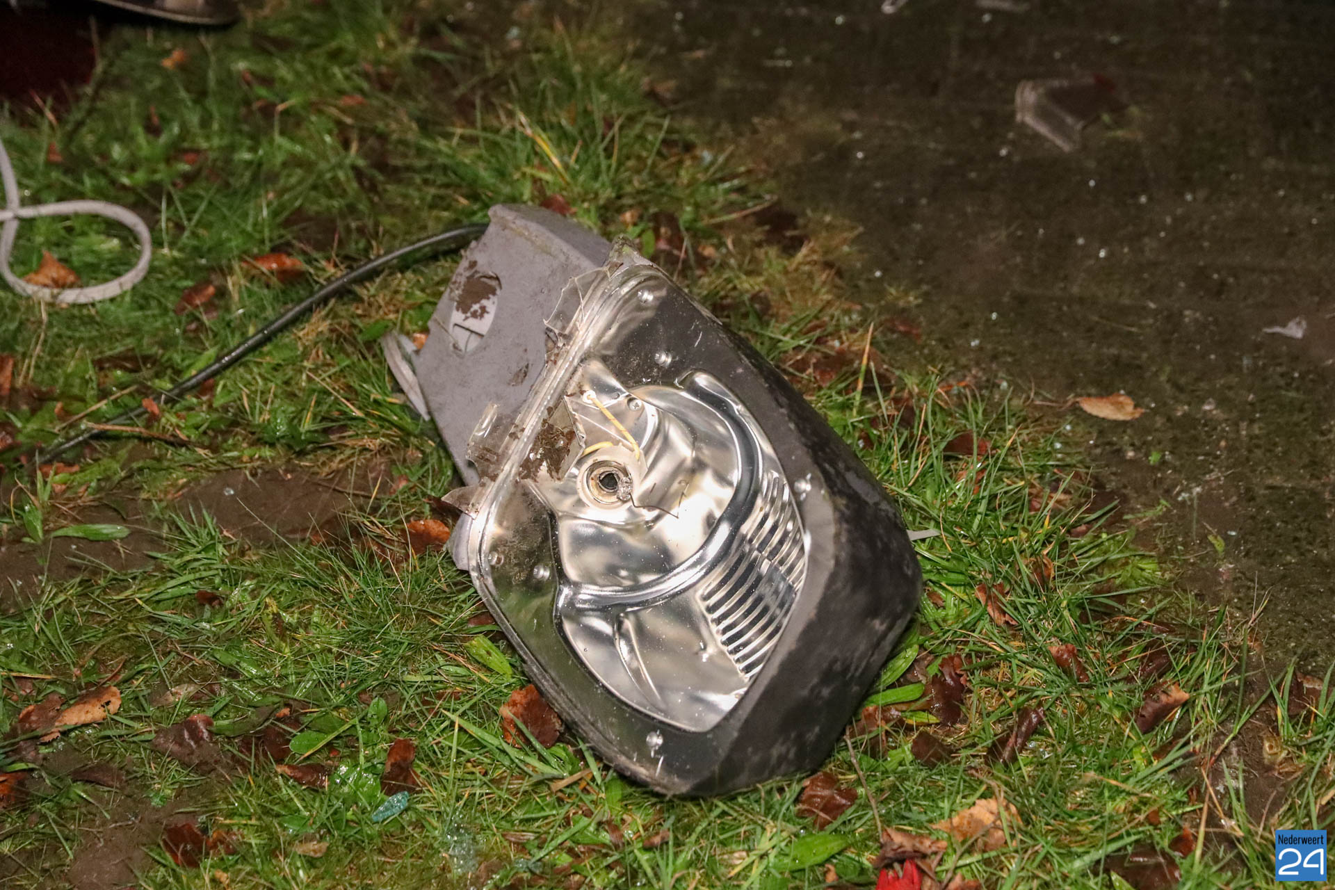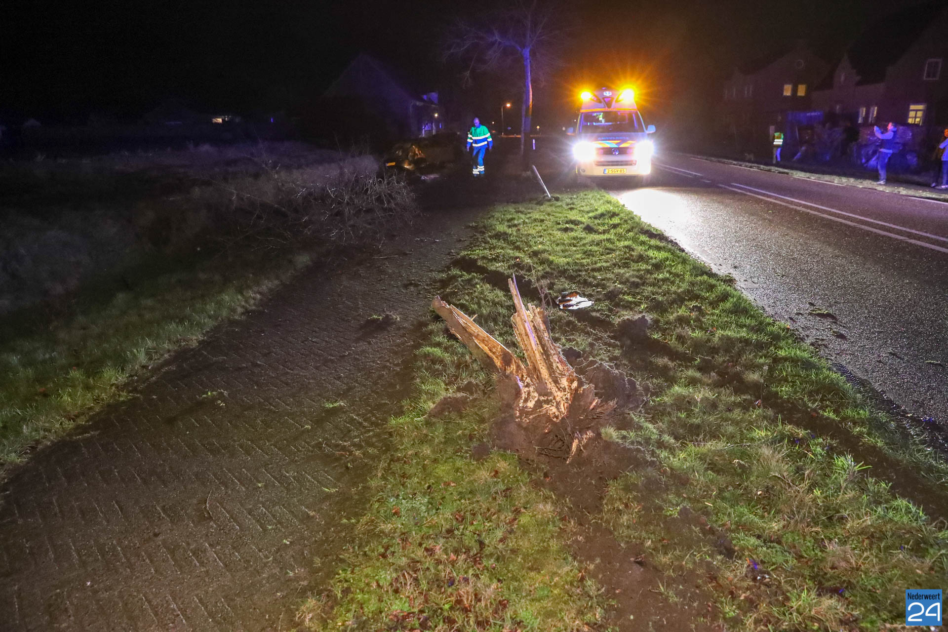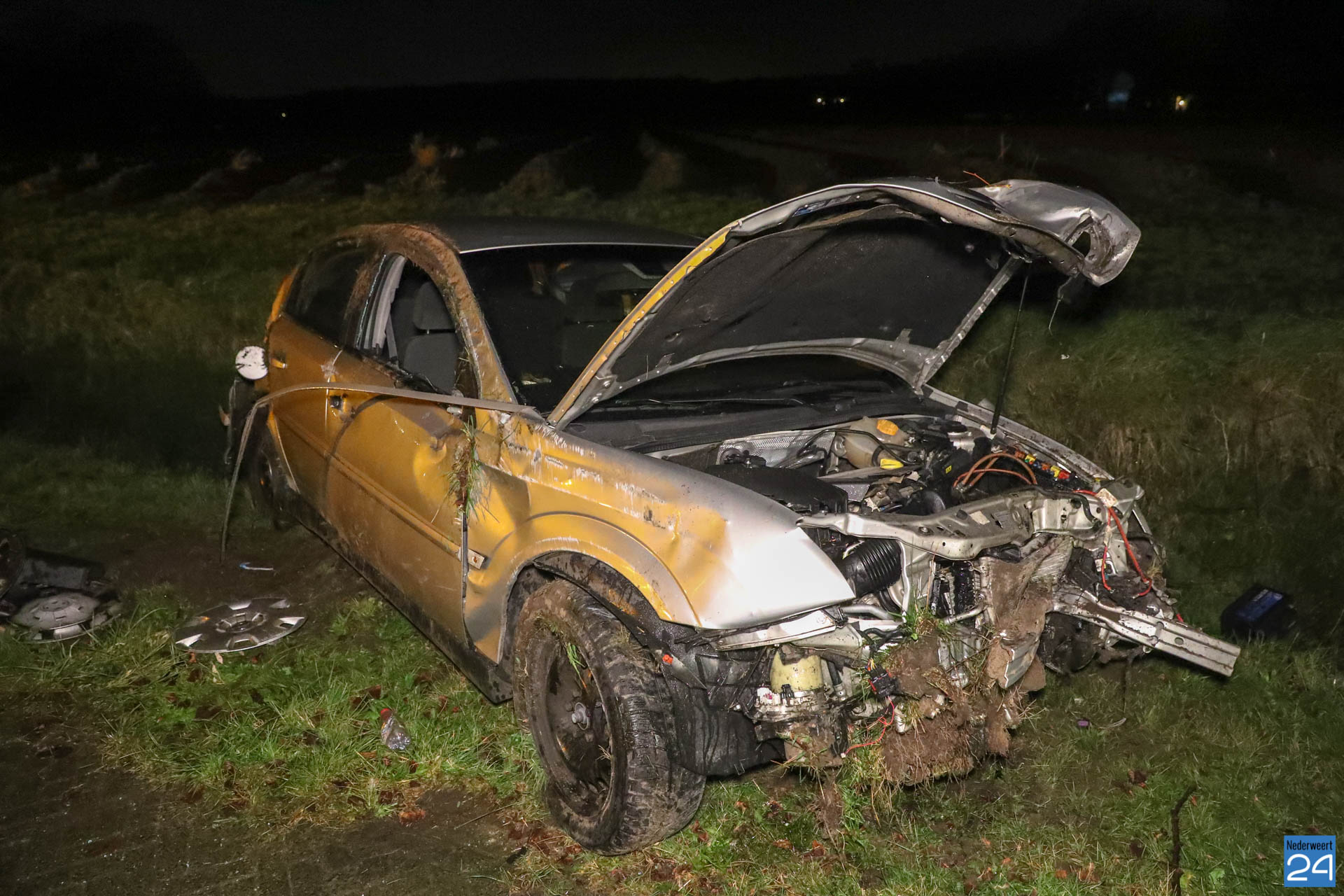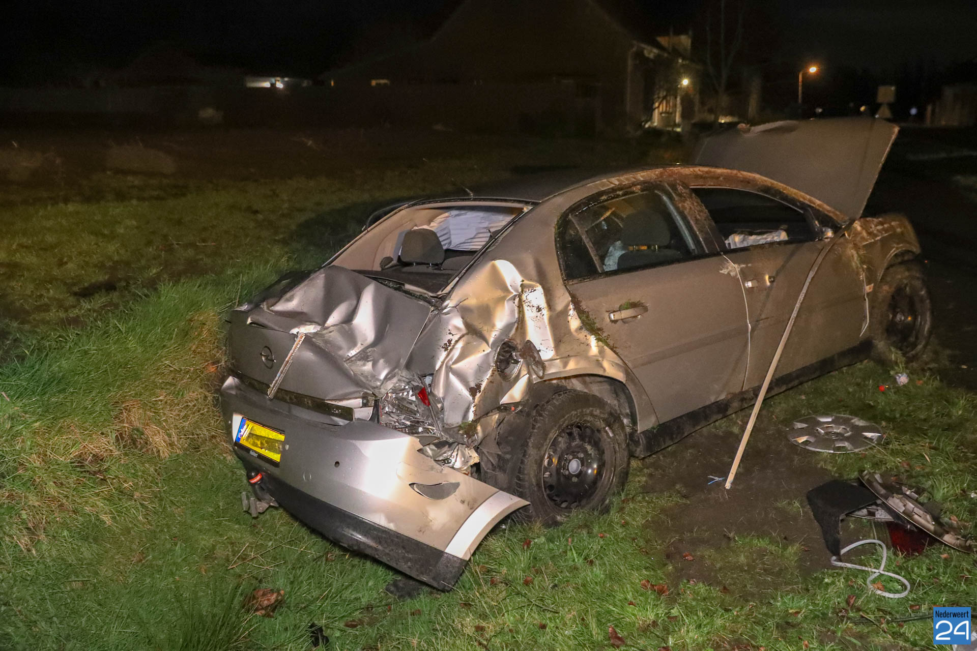 Het ambulancepersoneel heeft de bestuurder van de auto nagekeken maar hij maakt het wonder boven wonder goed. Zijn moeder heeft de jongeman opgehaald. De auto is total loss en wordt afgevoerd door een berger.
