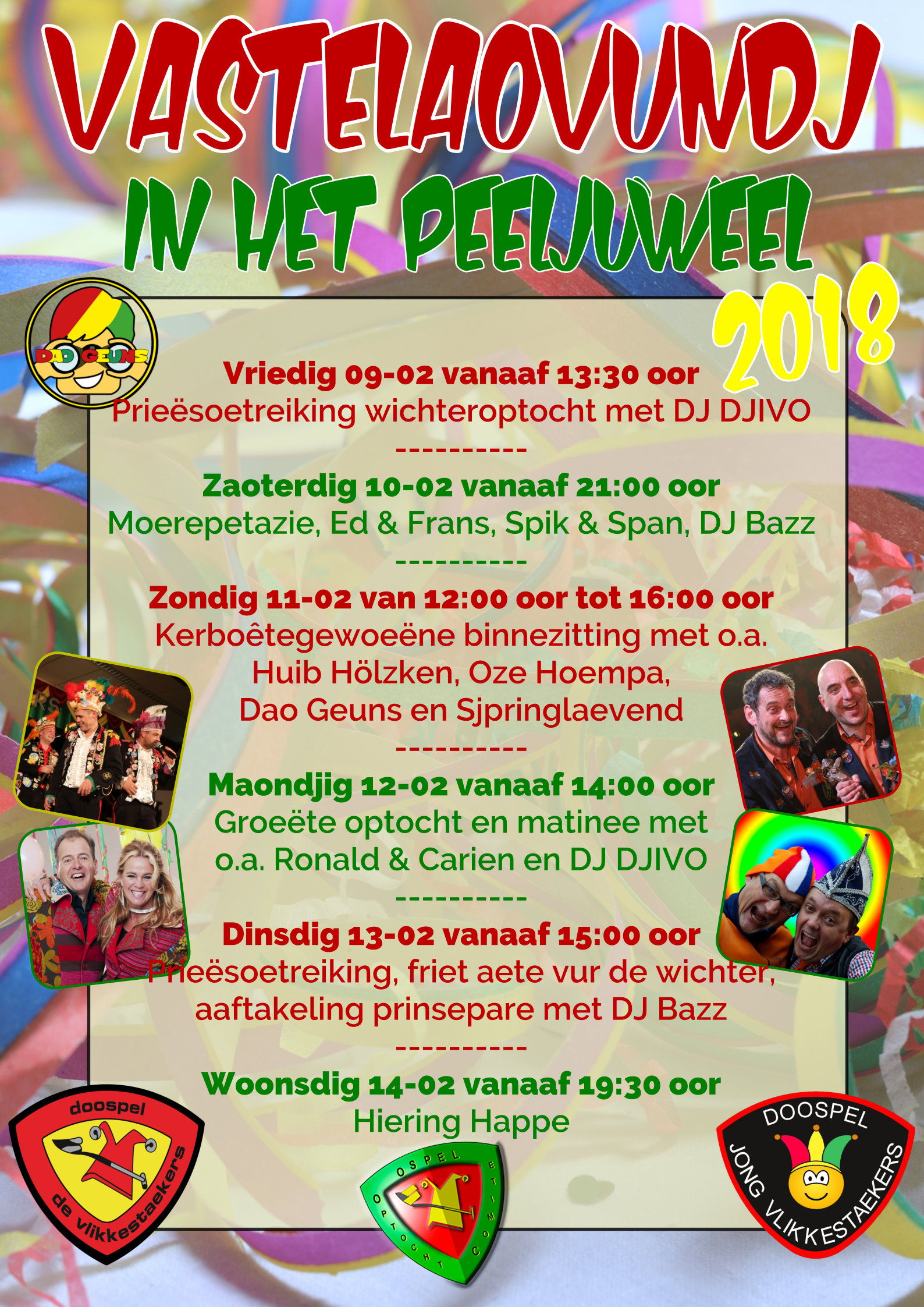 Zo zal zaterdag LVK winnaar Spik en Span een bezoek brengen aan het Vlikkepeliês. En wat dacht je van Moerepetazie, Ed & Frans, Sjpringlaevend, Ronald & Carien! Maar ook lokale artiesten zoals Drej kieër niks, Dao Geuns, Marco & Thijs, Huub Hölzken en uiteraard Oze Hoempa. Zij zullen allemaal deze vastelaovundj hun opwachting maken.