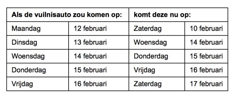 Ook de huisvuilroutes worden verplaatst. De vuilniswagen begint om 07.00 uur (behalve op zaterdag om 06.30 uur) te rijden. De gemeente vraagt je dan ook om de duobak op tijd klaar te zetten, eventueel de avond vóór de ophaaldag. De vuilniswagen kan op een ander tijdstip langskomen dan je gewend bent!