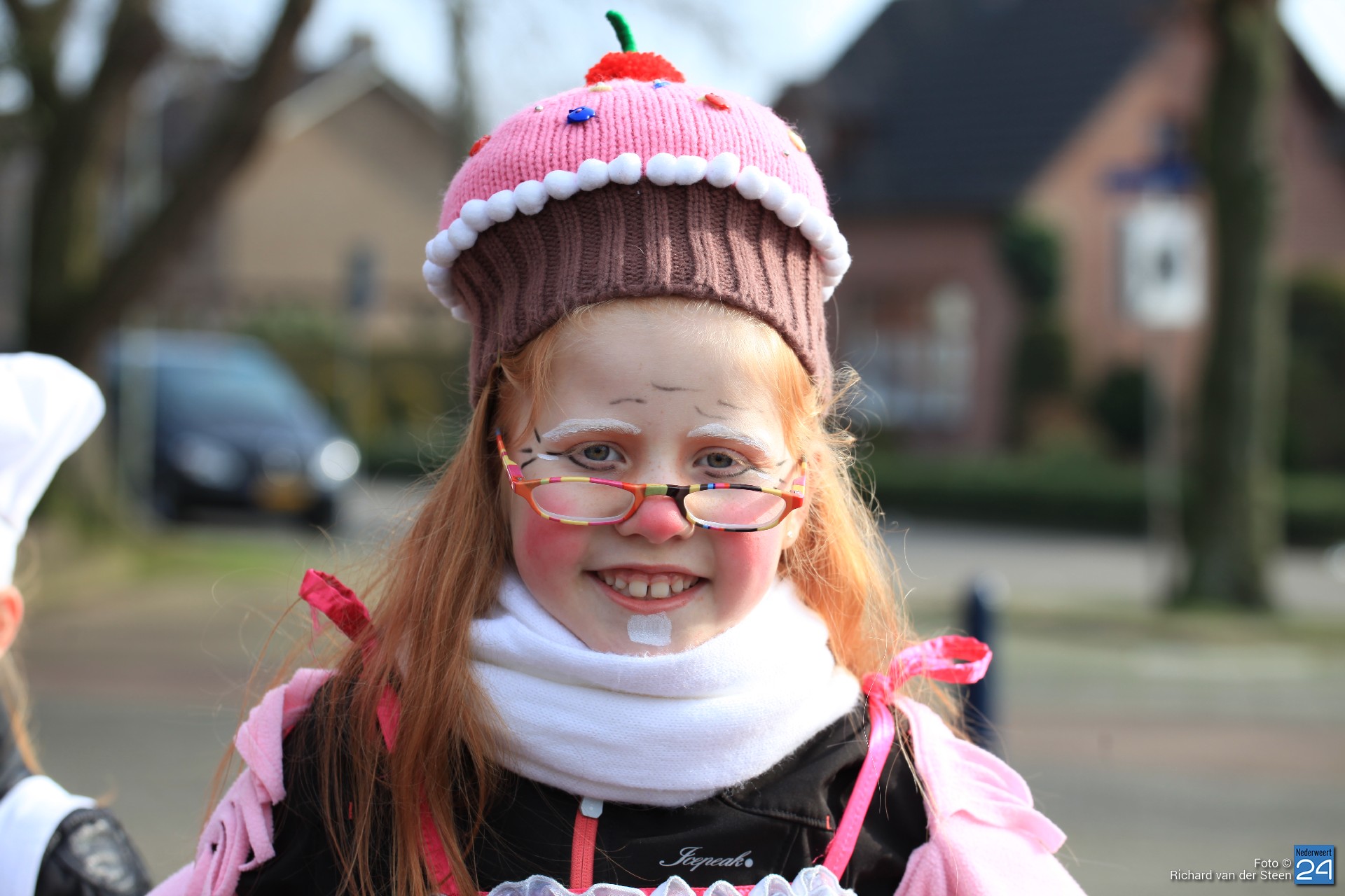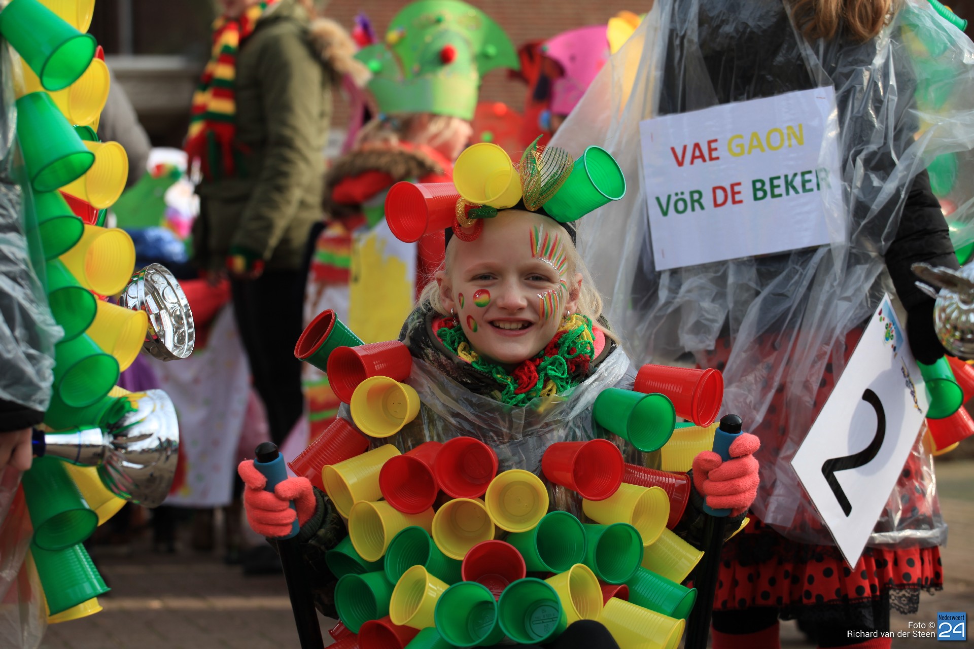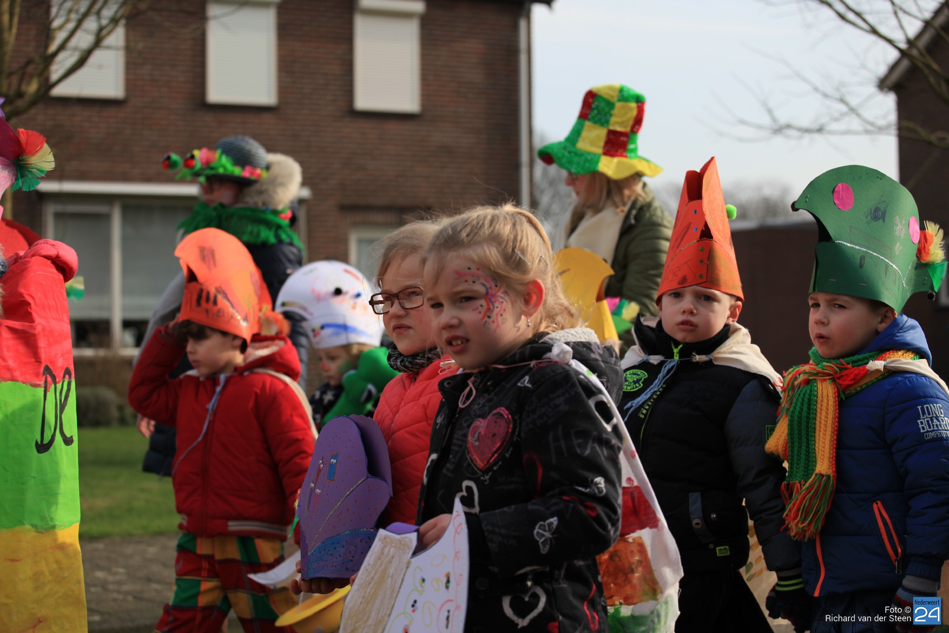 Het was koud maar droog en er stond gelukkig niet al te veel wind. Er stond veel publiek langs de kant van de weg en een goede “Vastelaovendj-stumming” maakte dat de schooloptocht er weer fantastisch uitzag. Alle kinderen deden actief mee én ook de teamleden stonden er weer gekleurd op.