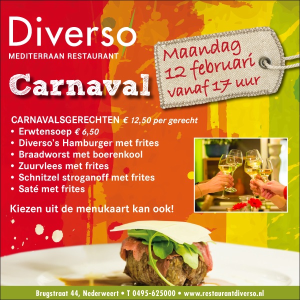 Aankomend weekend is Diverso normaal geopend, dus dagelijks vanaf 12.00 uur. Op carnavalsmaandag vanaf 17.00 uur staan naast de reguliere menukaart ook de ‘Carnavalsgerechten‘ op het menu.