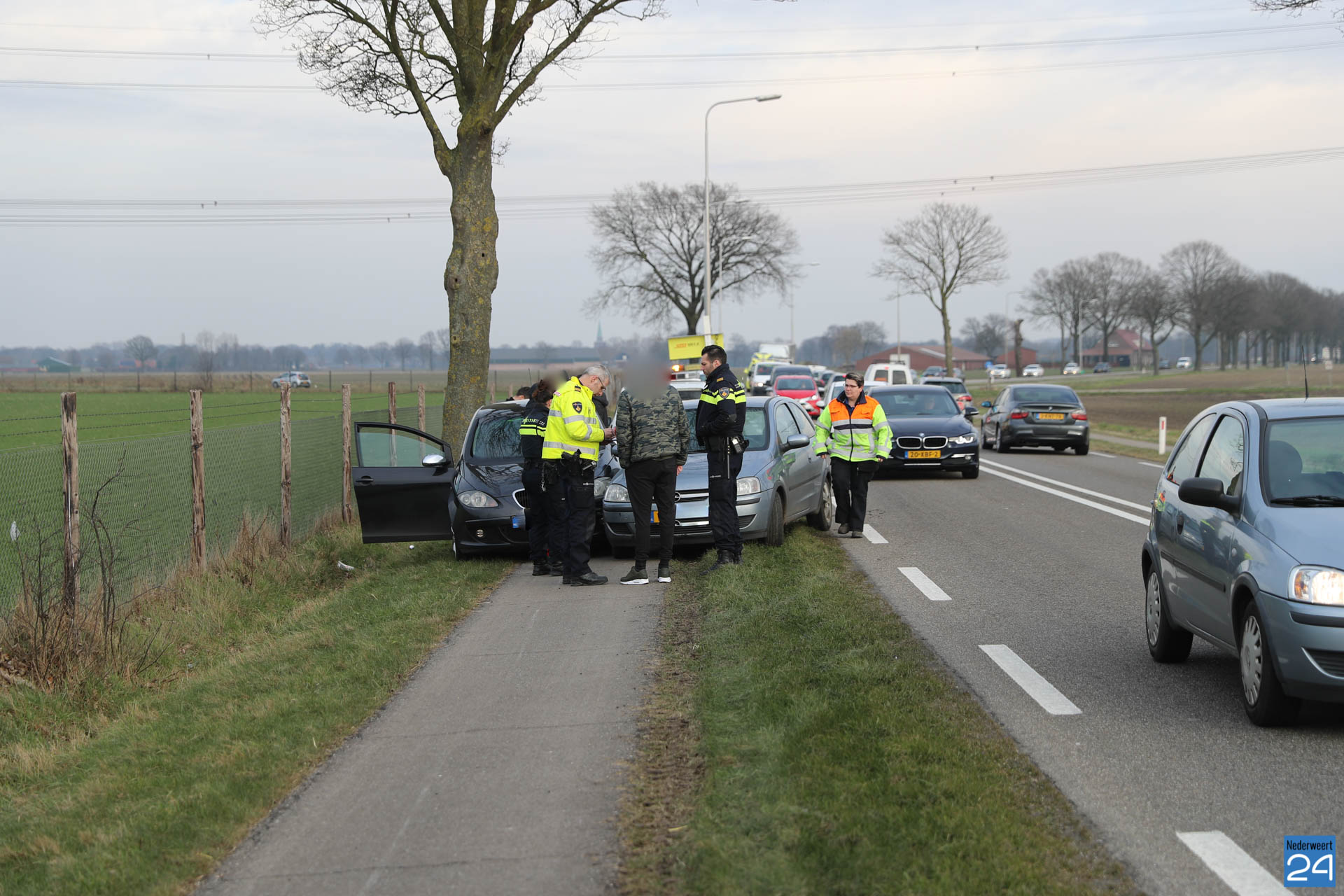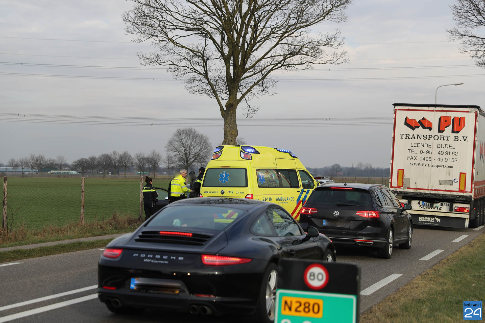 Maandagmiddag is een verkeersruzie op de N280 tussen Baexem en Kelpen-Oler geëindigd met een flinke knal en veel schade tot gevolg.
