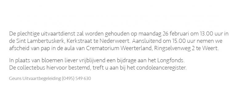 Namens de familie hartelijk dank voor alle hartverwarmende reacties, en de enorme belangstelling bij de uitvaart.