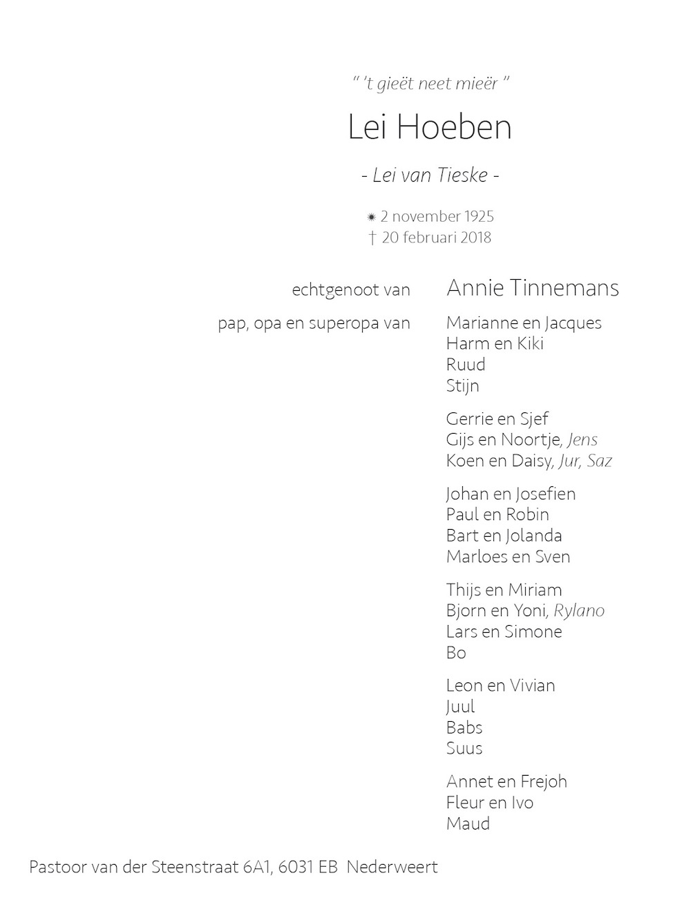Beste Familie Hoeben, gecondoleerd met het overlijden van je man Lei, jullie pap, schoonvader en opa. Heel veel sterkte toegewenst voor jullie allen.