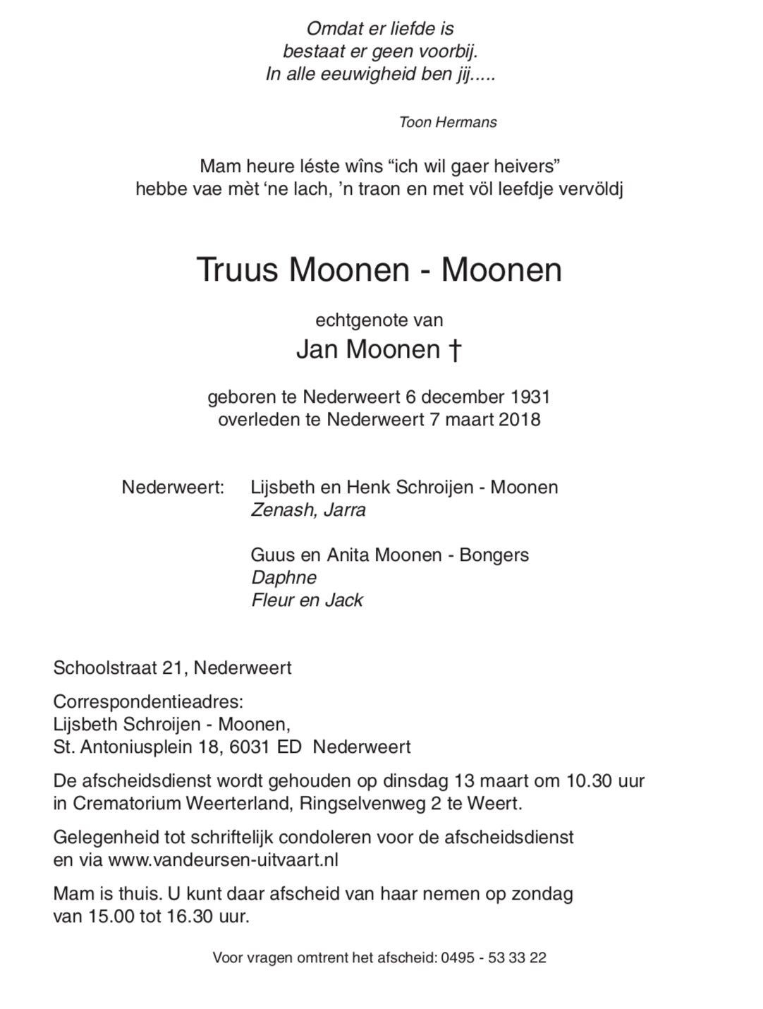 Overlijdensbericht Truus Moonen – Moonen