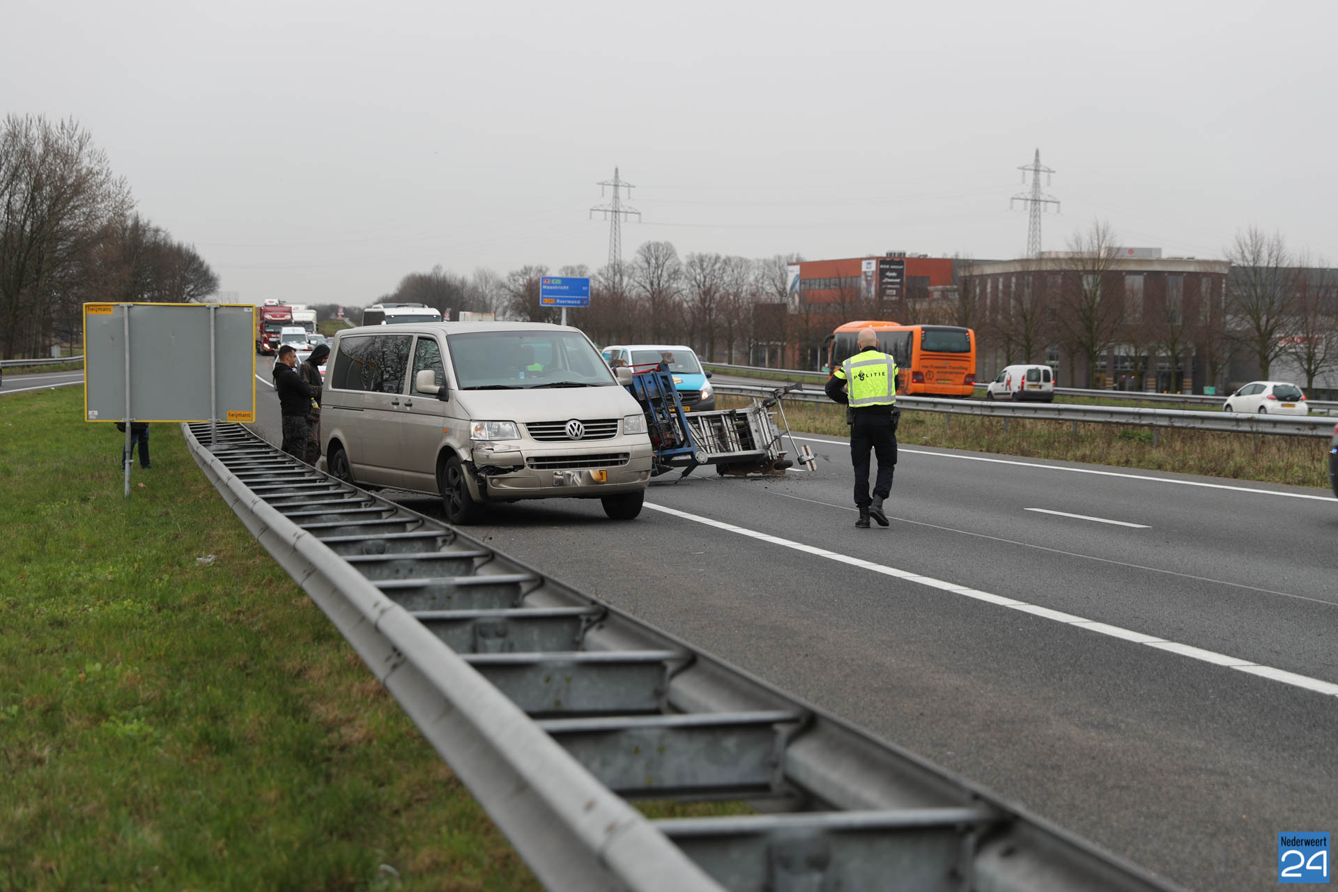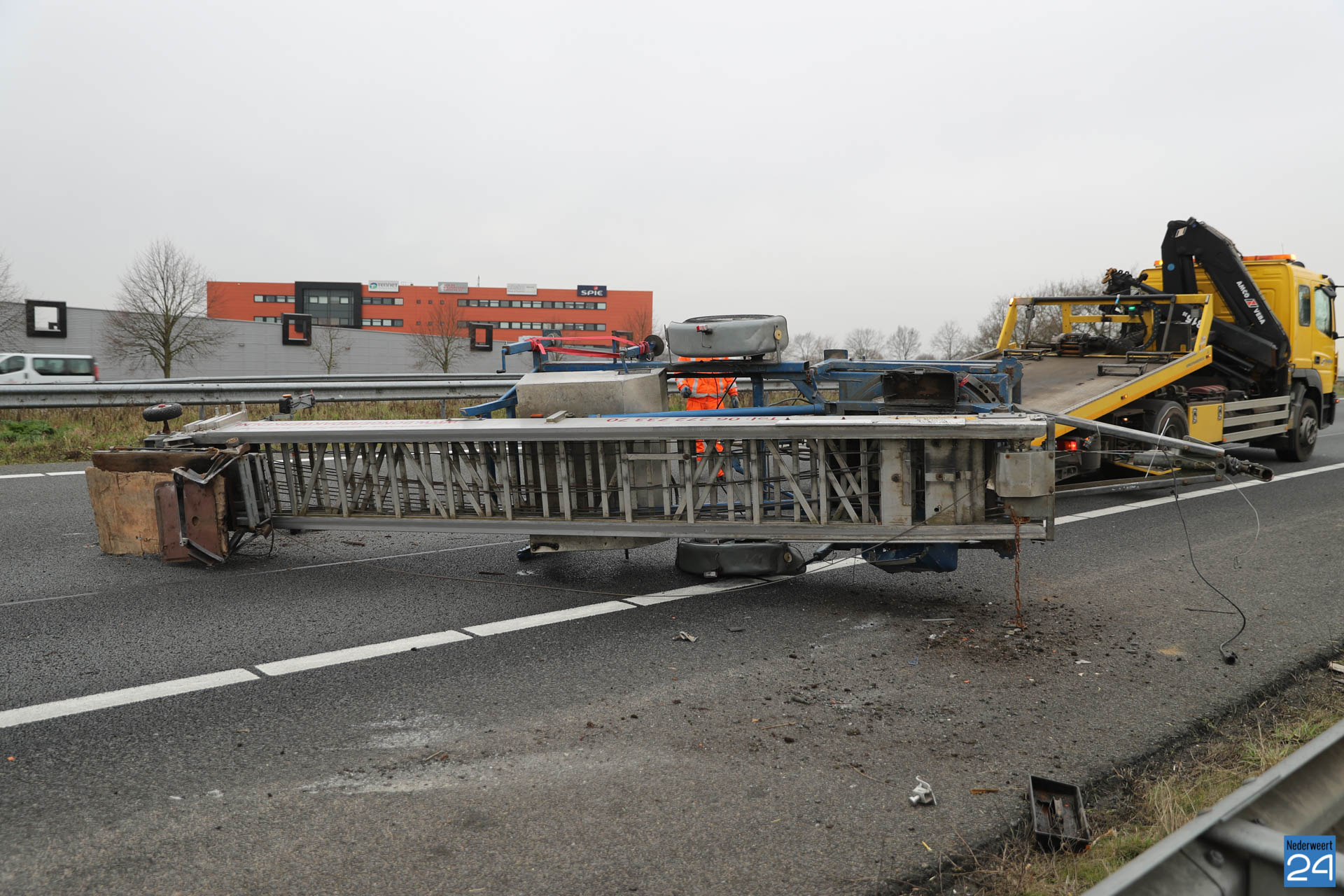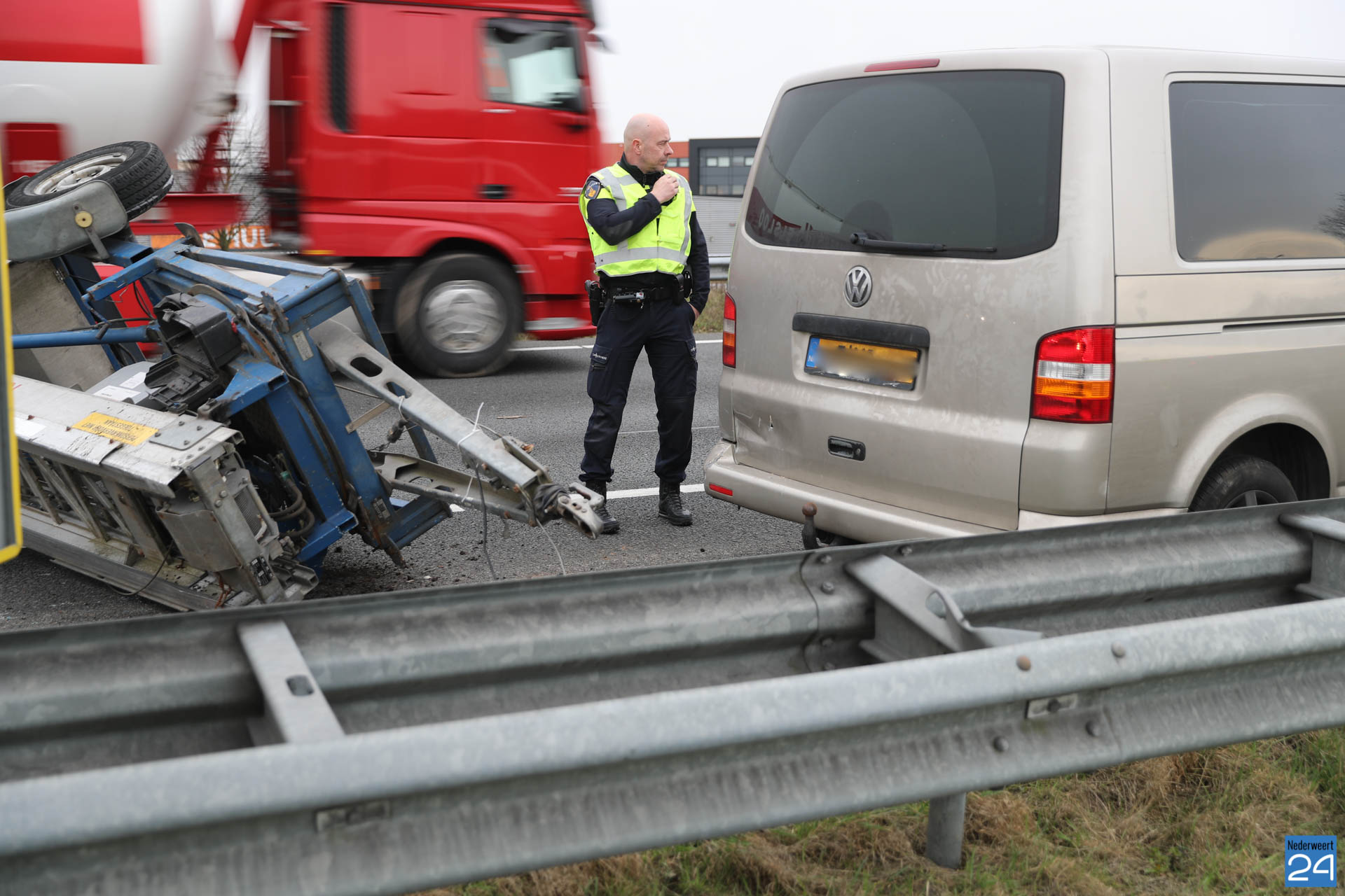 De bestuurder van de auto reed rustig richting huis toen plotseling de aanhanger op en neer begon te gaan. Ondanks afremmen werd het van kwaad tot erger. “Voor dat ik het in de gaten had zat ik met mijn bus in de vangrail en lag de pannenlift op z’n kant.” De bestuurder en zijn bijrijder kwamen met de schrik vrij.