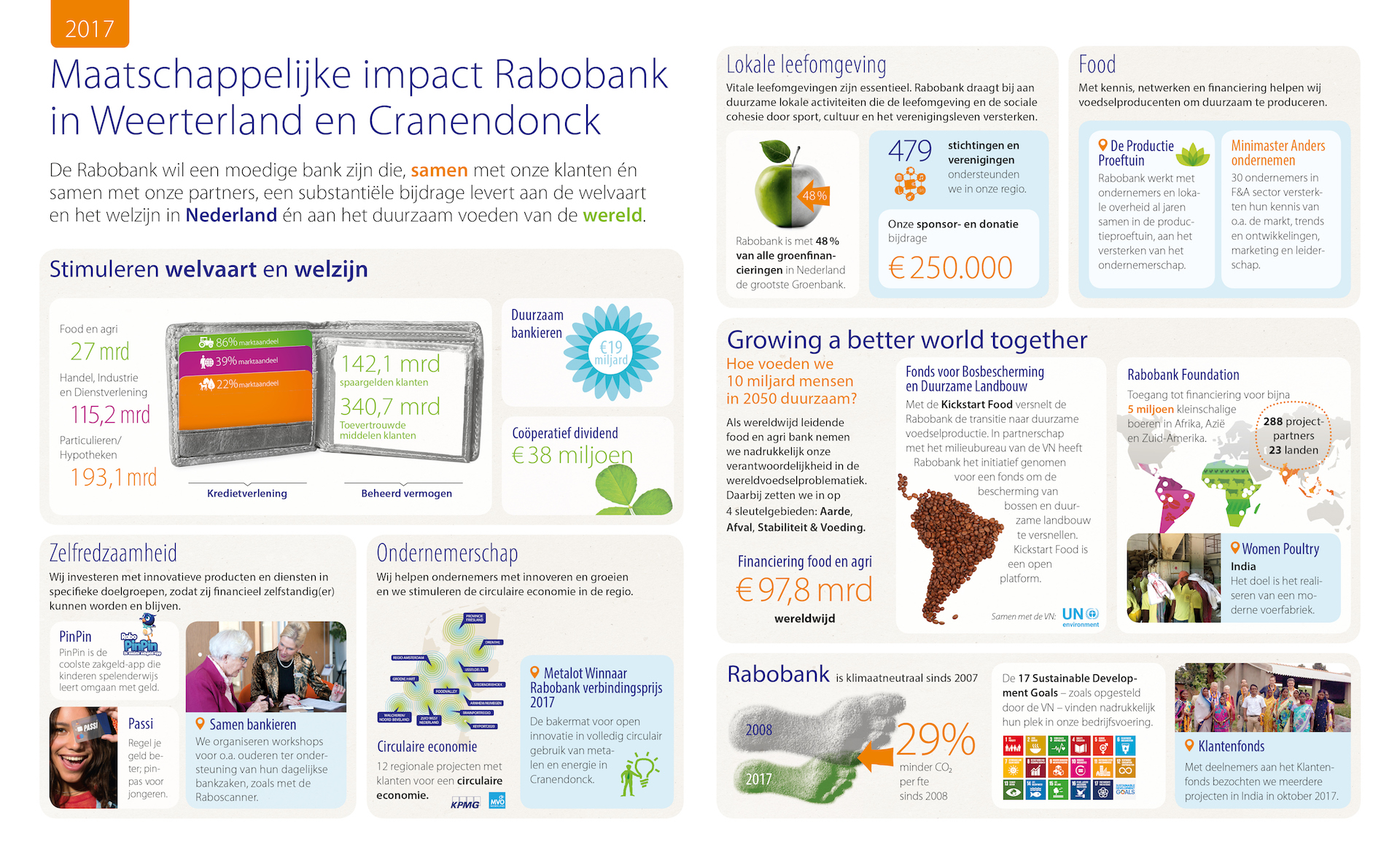 Rabobank is opgericht als coöperatieve bank: door boeren, voor boeren. Zij gelooft erin dat er voortgang geboekt kan worden door de handen ineen te slaan en samen op te staan. Voorbeelden hiervan zijn investeren in zelfredzaamheid, stimuleren van de circulaire economie in de regio, Banking for Food en Rabobank Foundation. Daarnaast streeft zij naar een vitale leefomgeving door bij te dragen aan duurzame, lokale activiteiten en de sociale cohesie door sport, cultuur en het verenigingsleven te versterken.