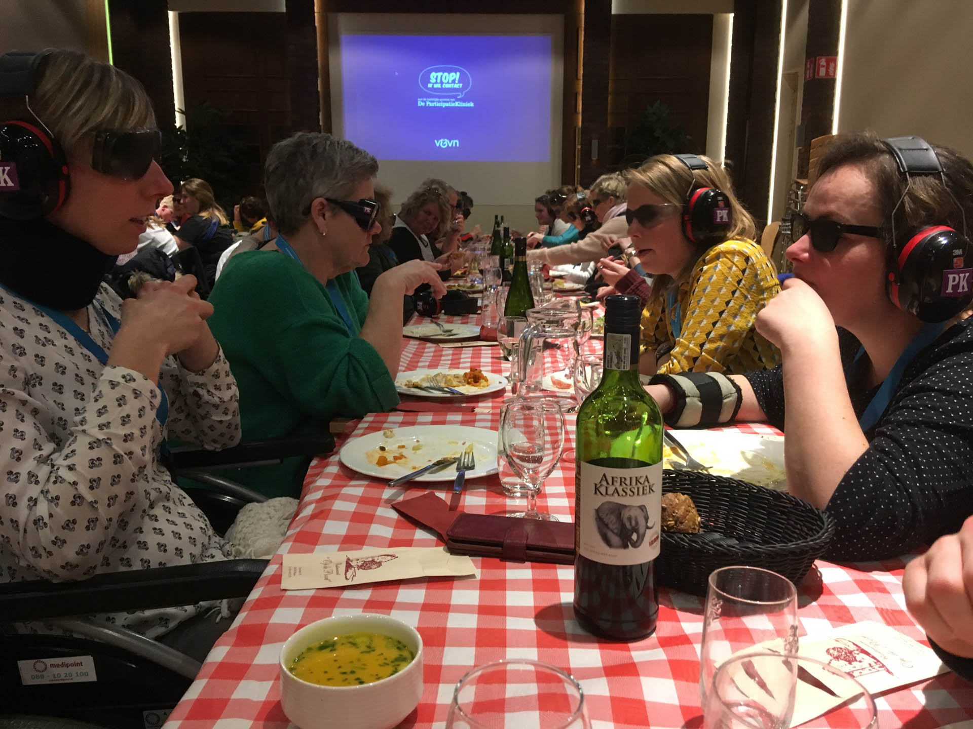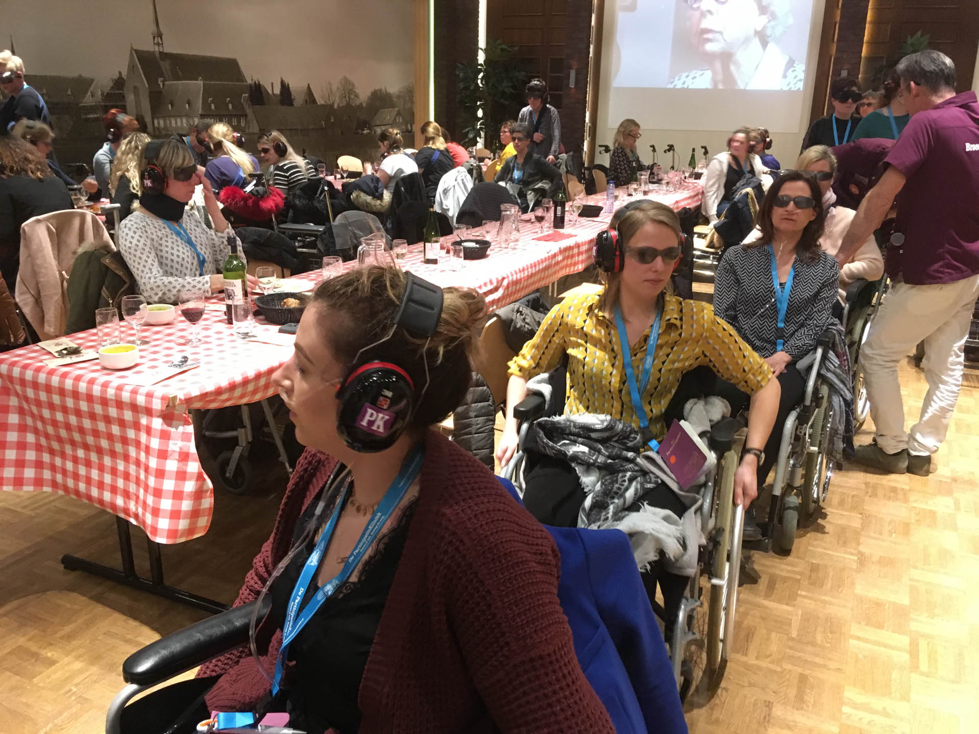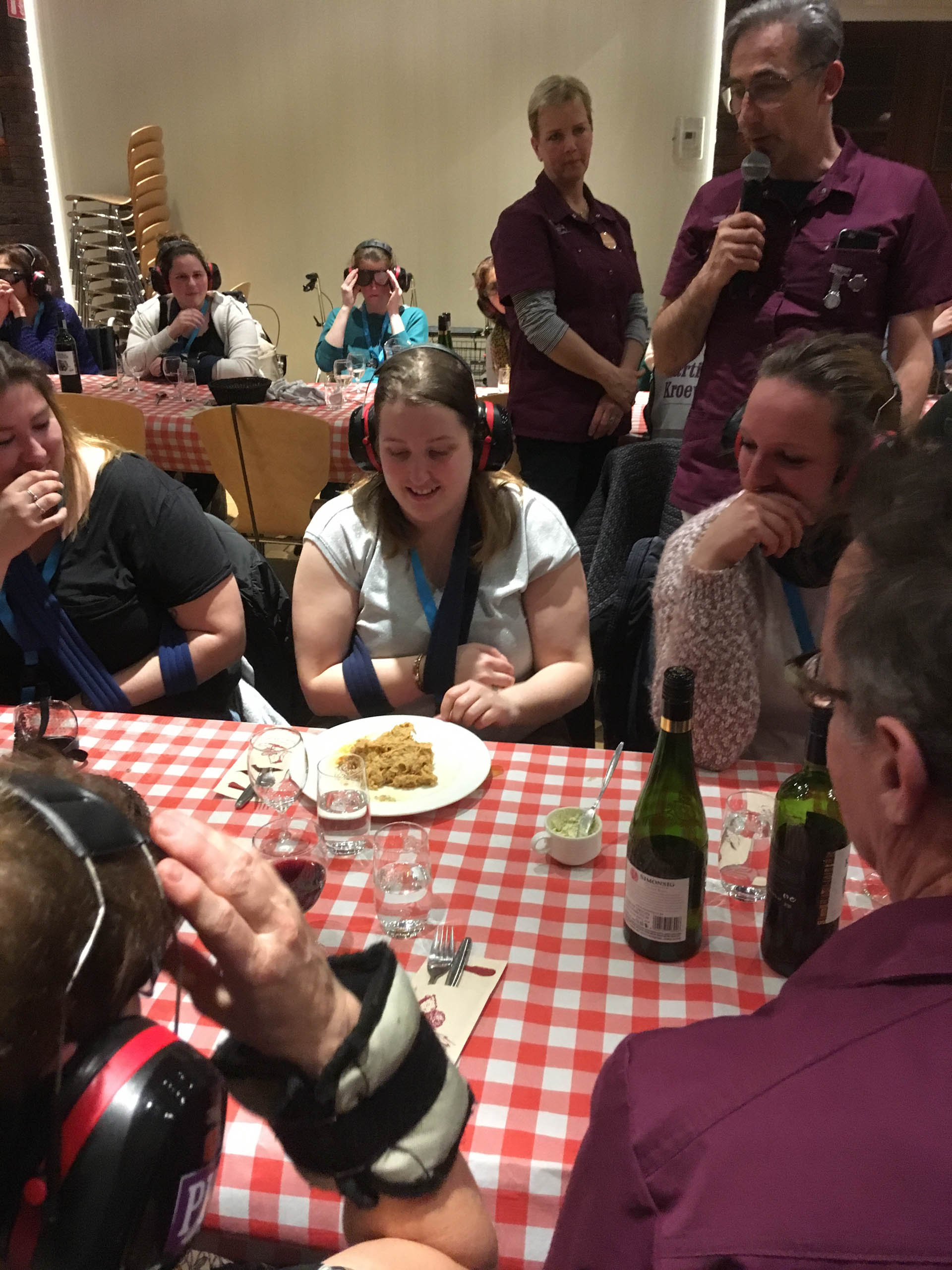 Na deze ervaringskamers kwam de echte uitdaging. Alle medewerkers trokken een levenslot en bijbehorend mankement. Met oorkappen, brillen waar je niet veel door ziet, gewichten om ledematen, mitella om de arm, rollators en rolstoelen toog de groep over de kinderkopjes in de avondschemer naar het nabijgelegen gemeenschapshuis om te gaan tafelen. Aan de grote tafel werd het al gauw stiller: “Er is niks aan. Het is heel vermoeiend”, “Ik hoor het alleen als iemand me bewust aanspreekt. De rest komt hard binnen als ruis. Ik focus me, maar het lukt niet. Frustrerend”, “Je wordt er onzeker van.” Ze relateren het aan hun cliënten. “Ik kan me best voorstellen dat iemand op tijd naar bed wil. Of het te druk vindt bij een grote activiteit.” Voor de medewerkers volgde nog een avondprogramma, de nacht in hun kamer, en de tweede dag waarop ze hun ervaringen delen en kijken hoe ze het in de praktijk kunnen brengen. Om nog meer handvaten te krijgen volgt binnenkort ook nog een clinic waarvoor de medewerkers hun collega’s en teamleiders kunnen uitnodigen. “Dit is een scholing die me bij blijft. Nou ja, zolang als mijn geheugen meewerkt dan.”