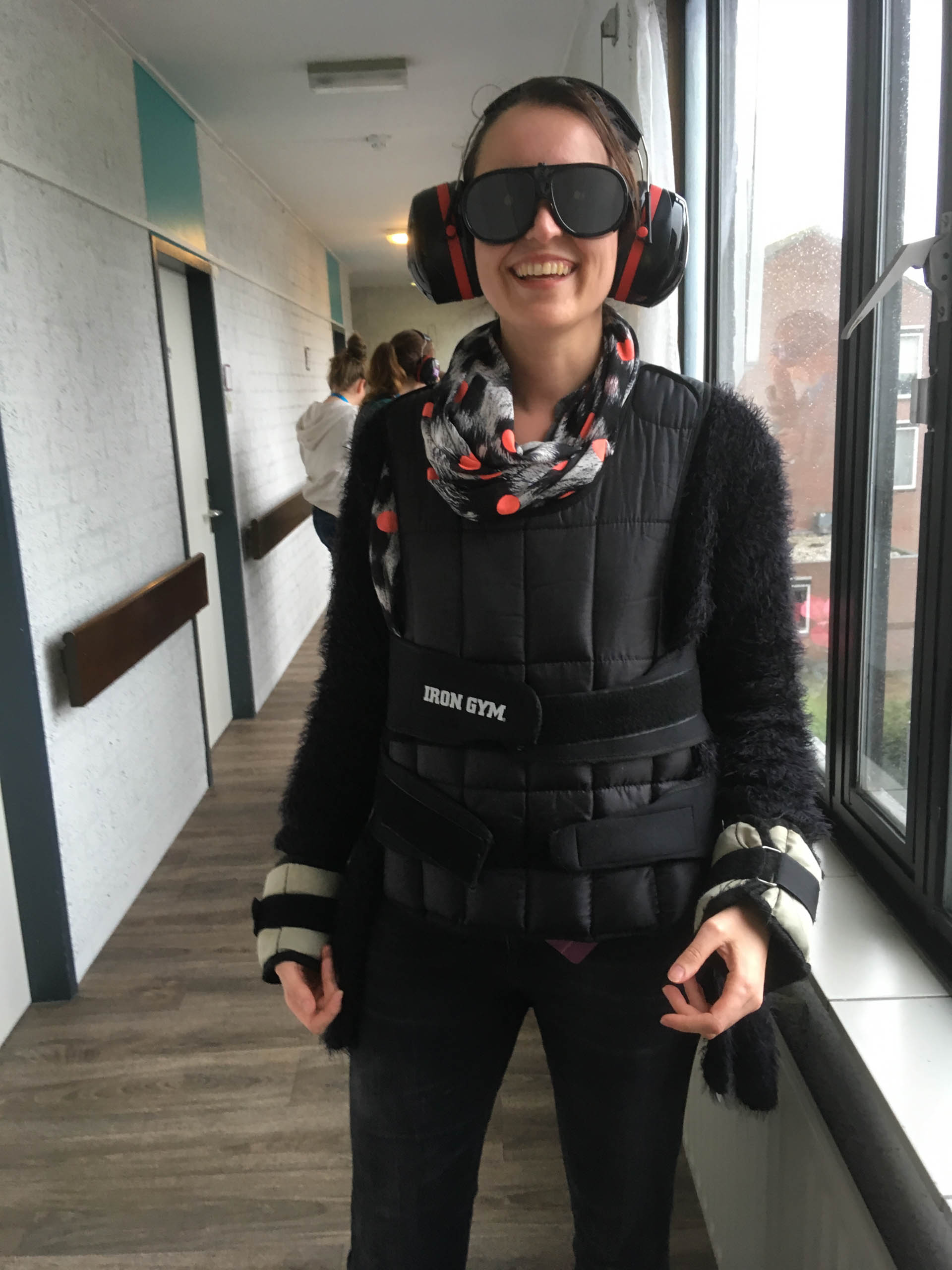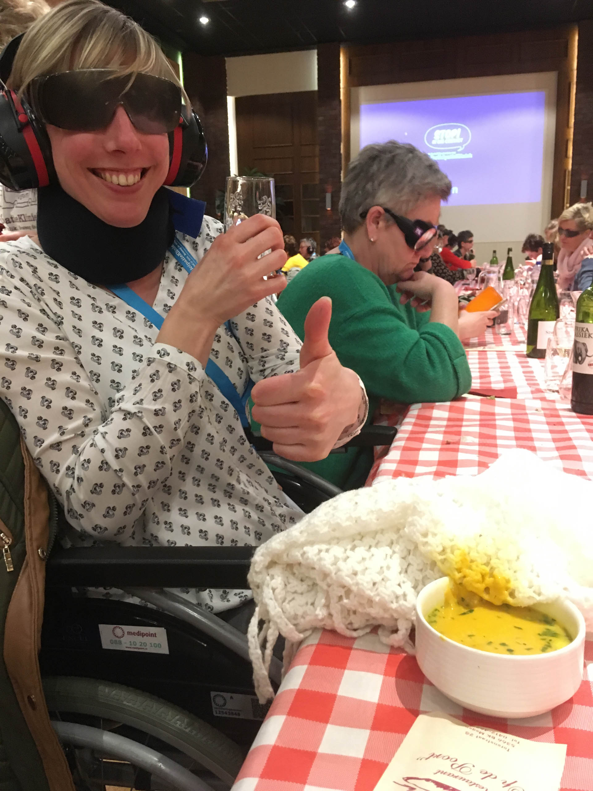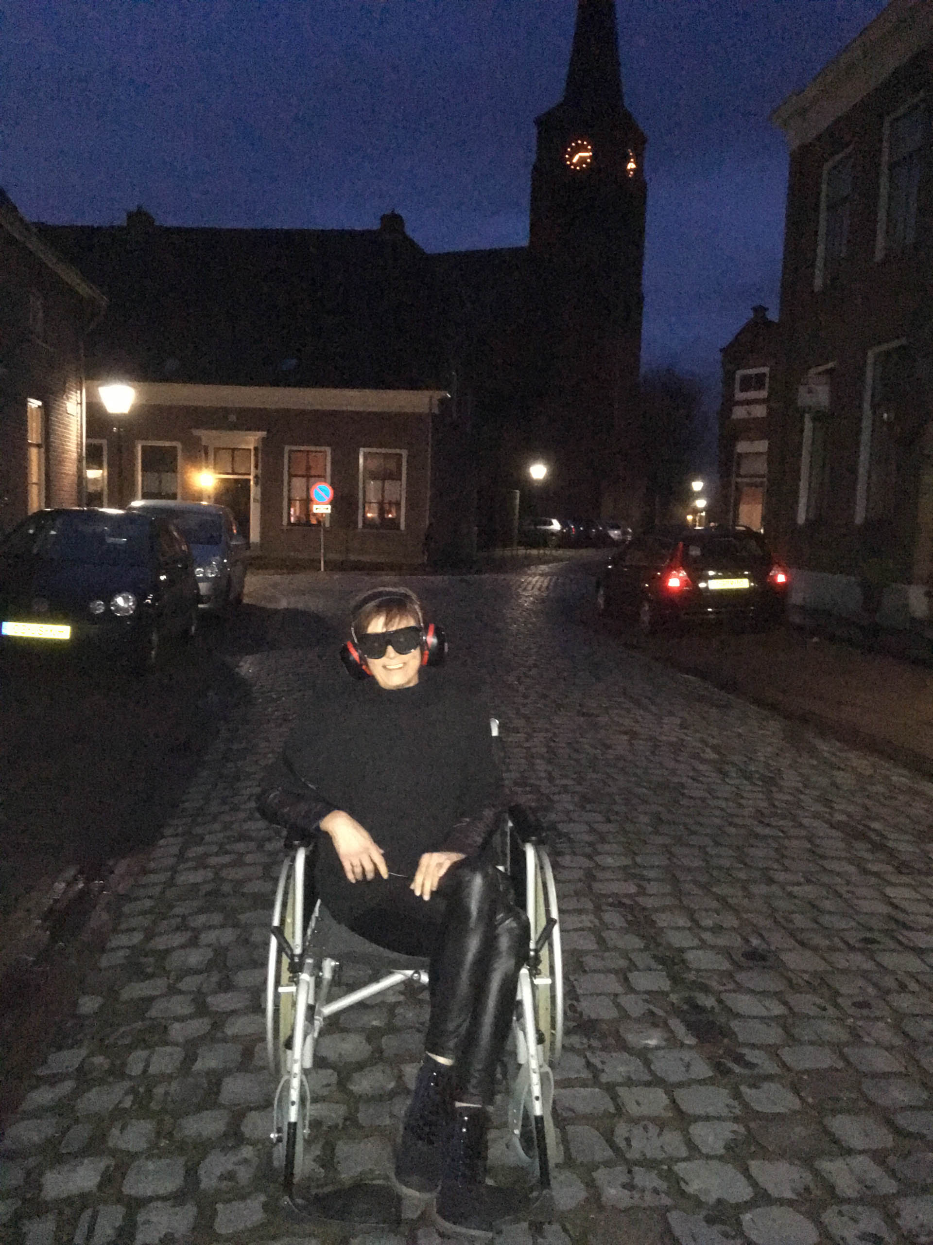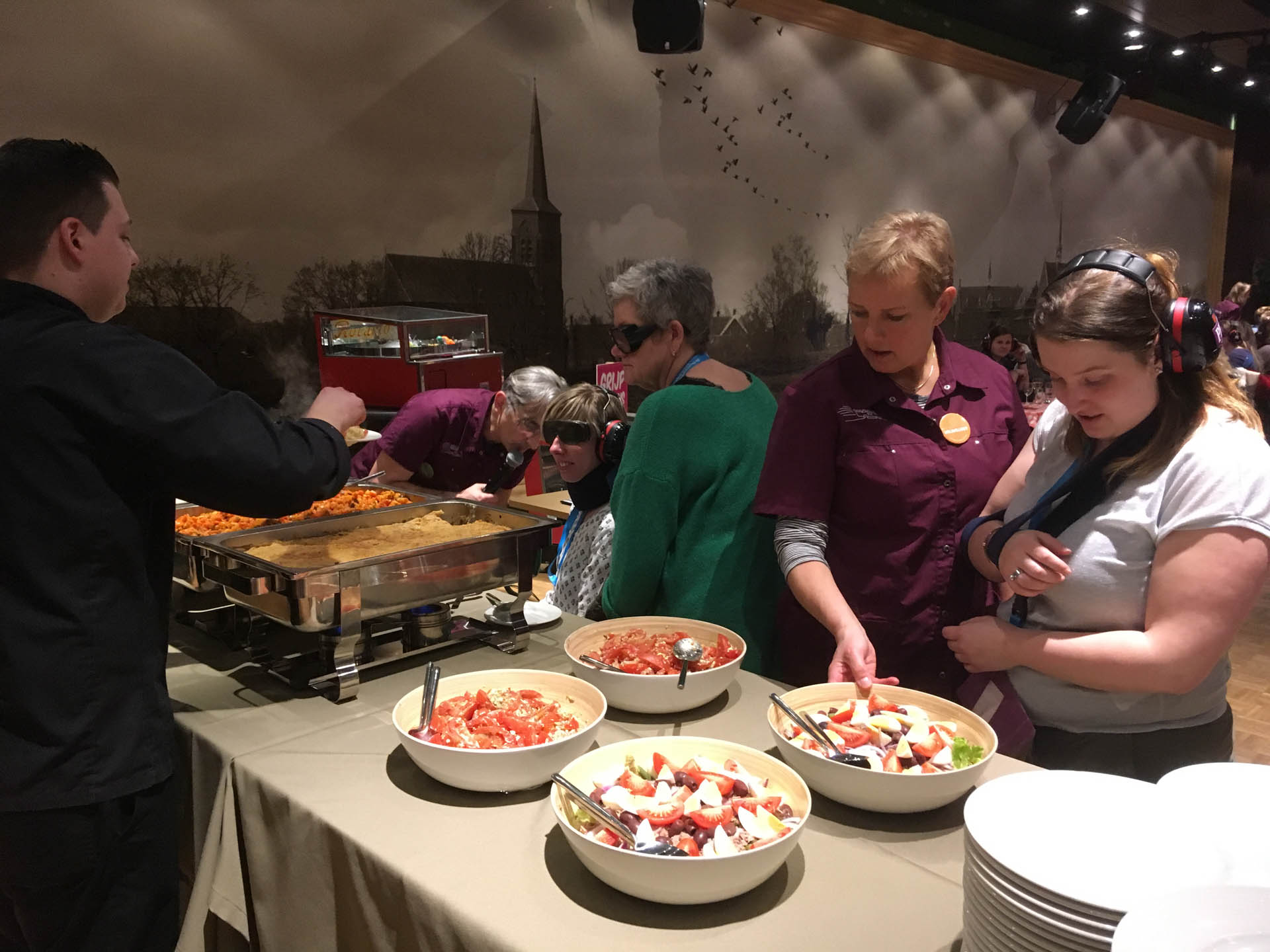 Na deze ervaringskamers kwam de echte uitdaging. Alle medewerkers trokken een levenslot en bijbehorend mankement. Met oorkappen, brillen waar je niet veel door ziet, gewichten om ledematen, mitella om de arm, rollators en rolstoelen toog de groep over de kinderkopjes in de avondschemer naar het nabijgelegen gemeenschapshuis om te gaan tafelen. Aan de grote tafel werd het al gauw stiller: “Er is niks aan. Het is heel vermoeiend”, “Ik hoor het alleen als iemand me bewust aanspreekt. De rest komt hard binnen als ruis. Ik focus me, maar het lukt niet. Frustrerend”, “Je wordt er onzeker van.” Ze relateren het aan hun cliënten. “Ik kan me best voorstellen dat iemand op tijd naar bed wil. Of het te druk vindt bij een grote activiteit.” Voor de medewerkers volgde nog een avondprogramma, de nacht in hun kamer, en de tweede dag waarop ze hun ervaringen delen en kijken hoe ze het in de praktijk kunnen brengen. Om nog meer handvaten te krijgen volgt binnenkort ook nog een clinic waarvoor de medewerkers hun collega’s en teamleiders kunnen uitnodigen. “Dit is een scholing die me bij blijft. Nou ja, zolang als mijn geheugen meewerkt dan.”