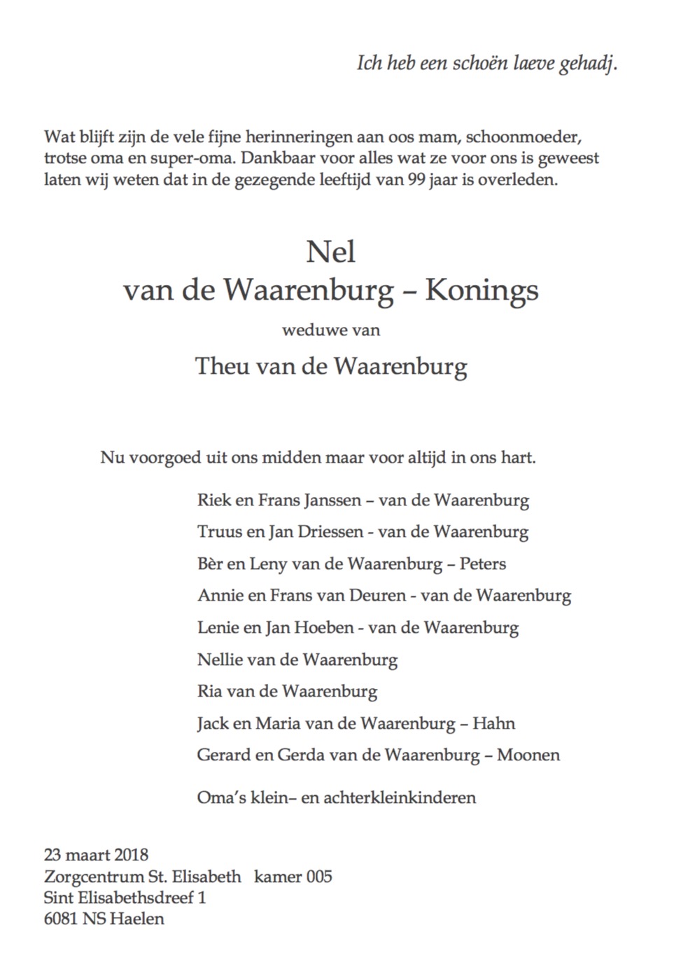 Overlijdensbericht: Nel van de Waarenburg – Konings