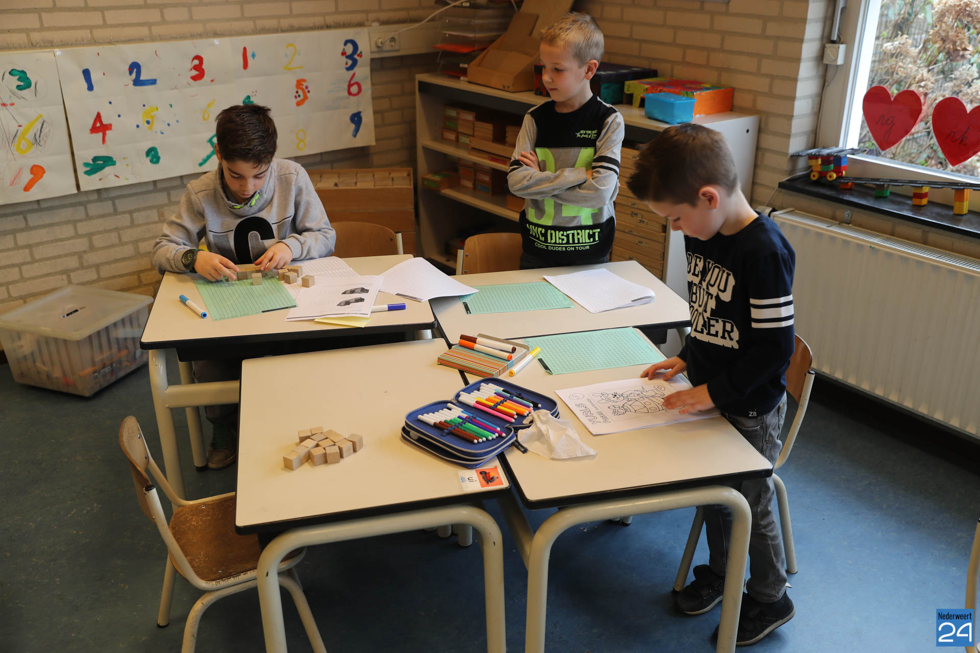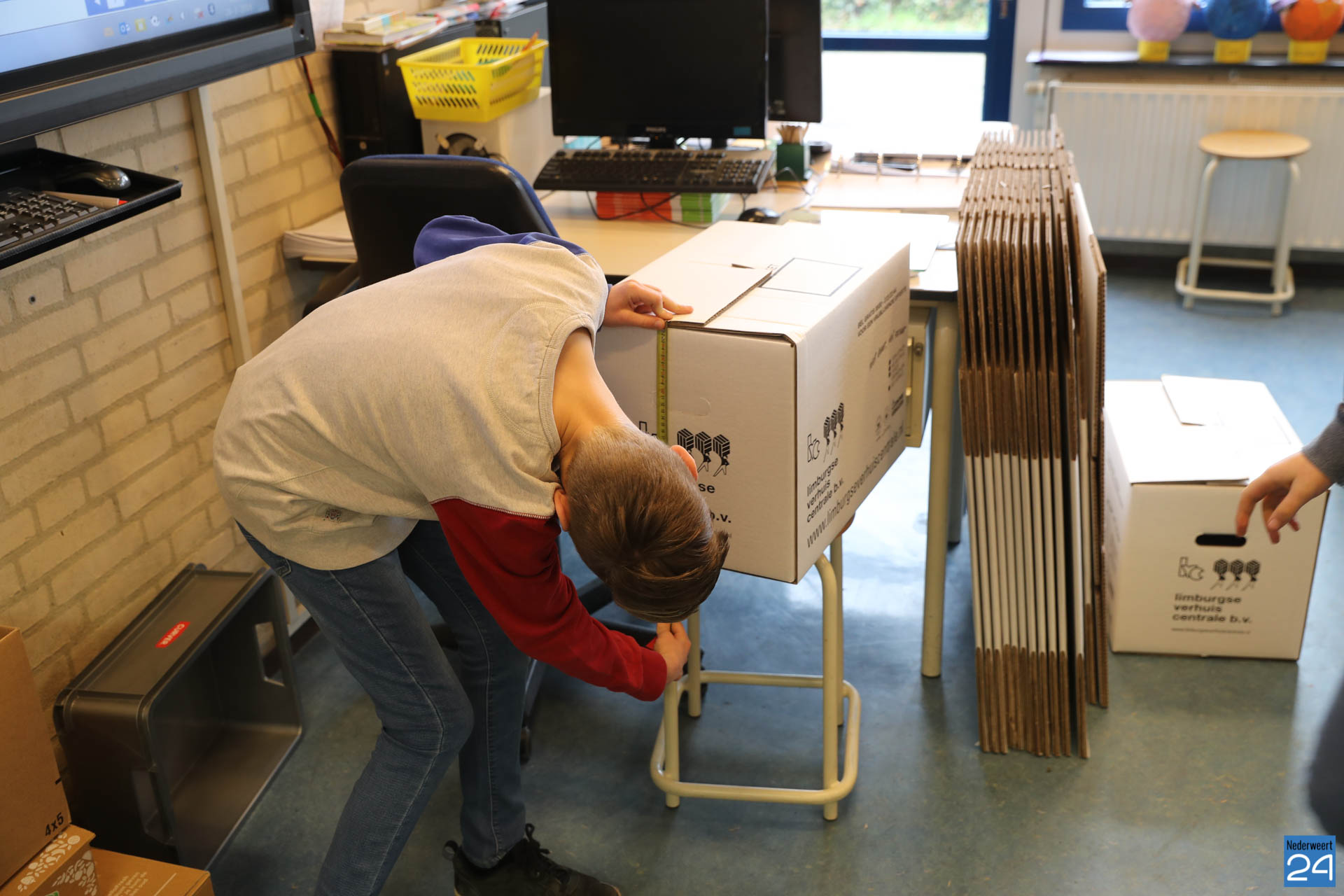 De leerlingen werken in verschillende leerstofdomeinen. Zo leren ze met coderingen om plaatsaanduiding te voorzien van een specifieke code. Wanneer leerlingen nagaan hoeveel dozen of containers in een bepaalde ruimte passen, passen ze meetvaardigheden toe. Dat doen ze ook als ze handig tellen hoeveel dozen of doosjes op een bepaalde plek staan of zouden kunnen passen.