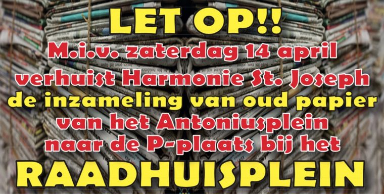 Elke tweede zaterdag van de maand zamelt Harmonie Sint Joseph Nederweert ten bate van hun verenigingskas oud papier in op twee pleinen. Uit oogpunt van verkeersveiligheid wordt met ingang van aanstaande zaterdag 14 april de oud papiercontainer verplaatst van het Sint Antoniusplein naar de parkeerplaats naast het gemeentehuis aan het Raadhuisplein. De inzameling op het Rochusplein wijzigt niet.