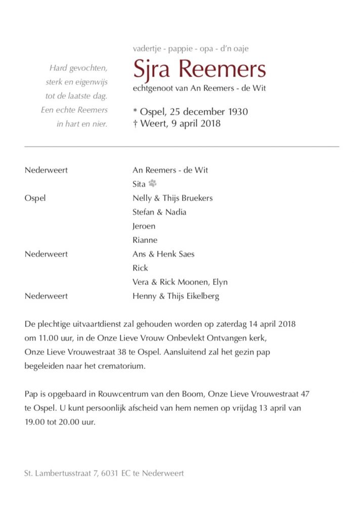 Familie Reemers de Wit veel sterkte allemaal van het verlies van jullie Sjra.