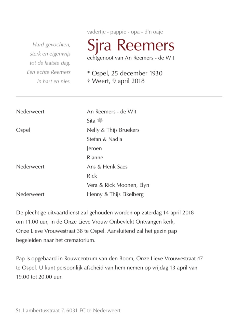 Familie Reemers de Wit veel sterkte allemaal van het verlies van jullie Sjra.