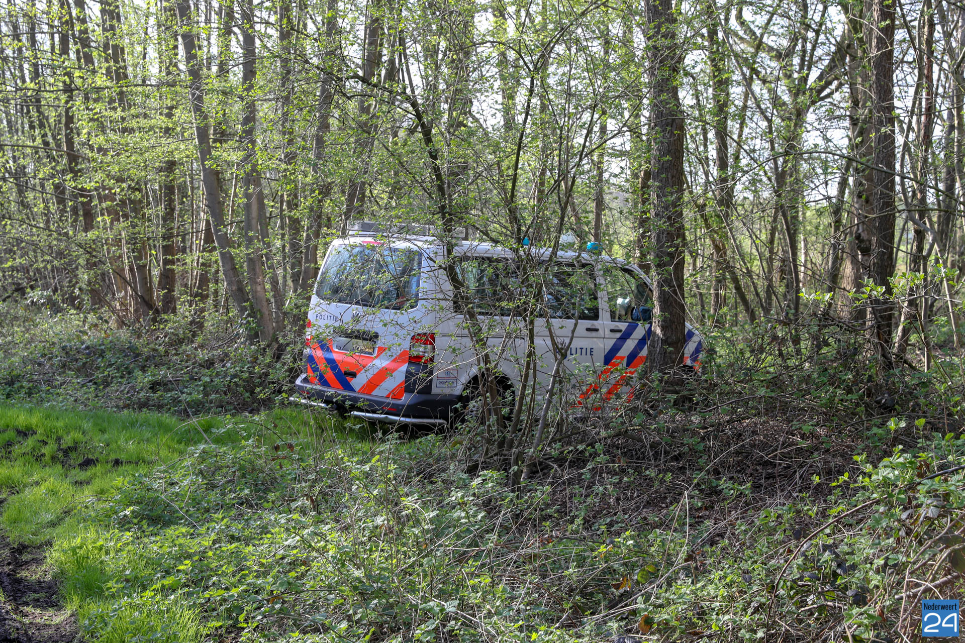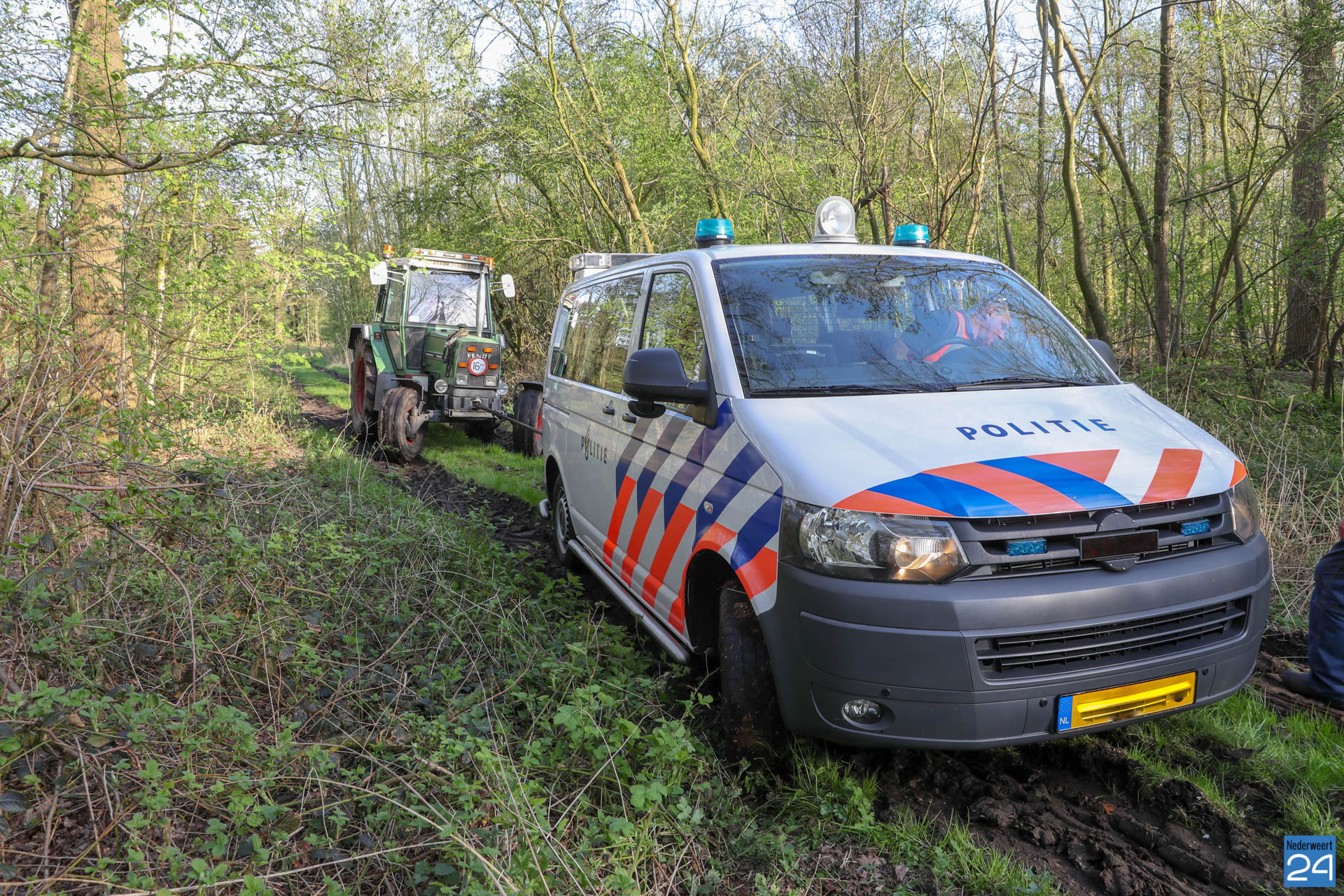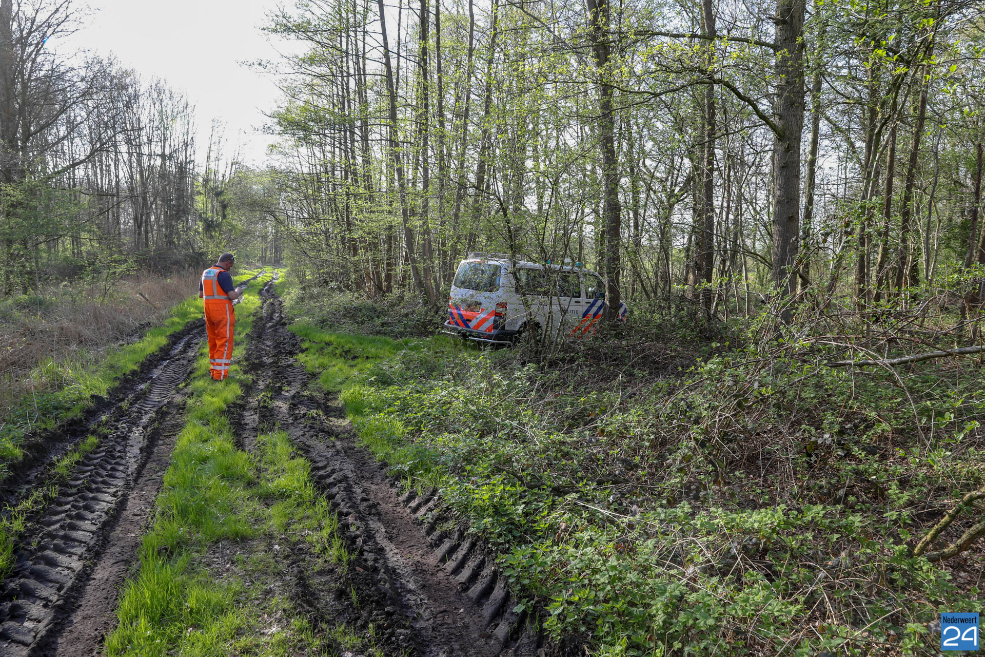 Dinsdagmiddag is een politiebus vast komen zitten in de modder op een drassig zandpad, vlakbij de Mildert in Kelpen-Oler. De politieagent was vanuit Roermond onderweg voor een ‘klein klusje‘ langs het kanaal bij Nederweert.