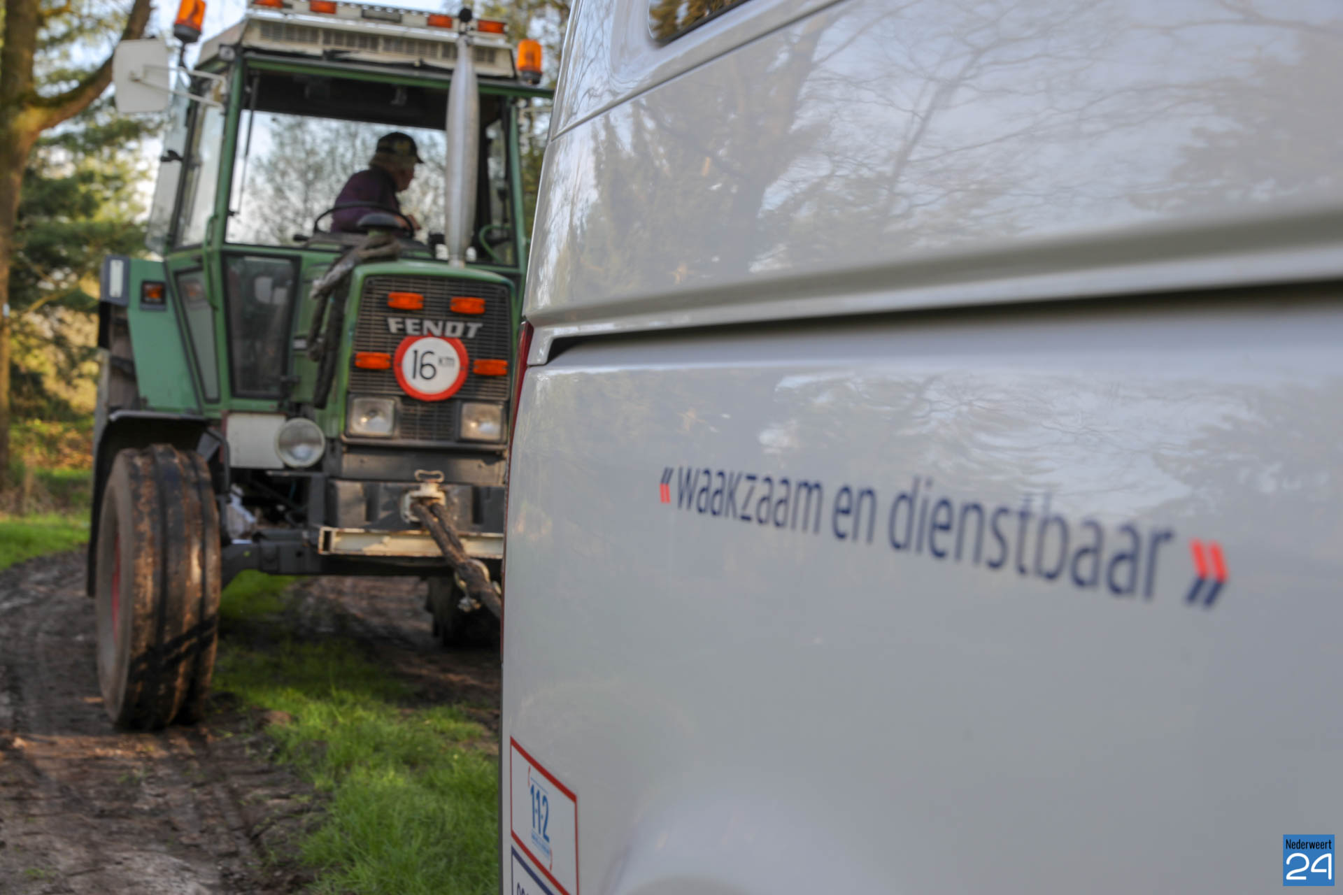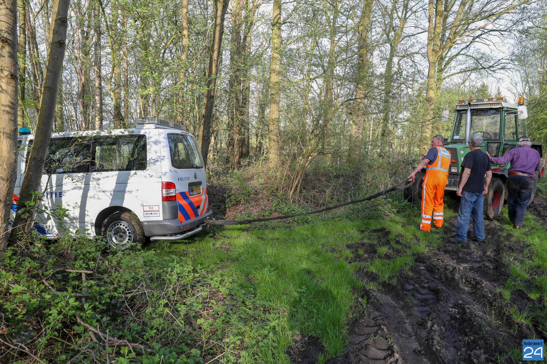 De meldkamer liet een berger ter plaatse komen maar die kon op de drassige weg ook weinig betekenen. Een boer uit de buurt werd ingeschakeld om de politiebus uit de modder te slepen. Eind goed al goed. ‘Waakzaam en dienstbaar’ geldt in deze voor de boer!