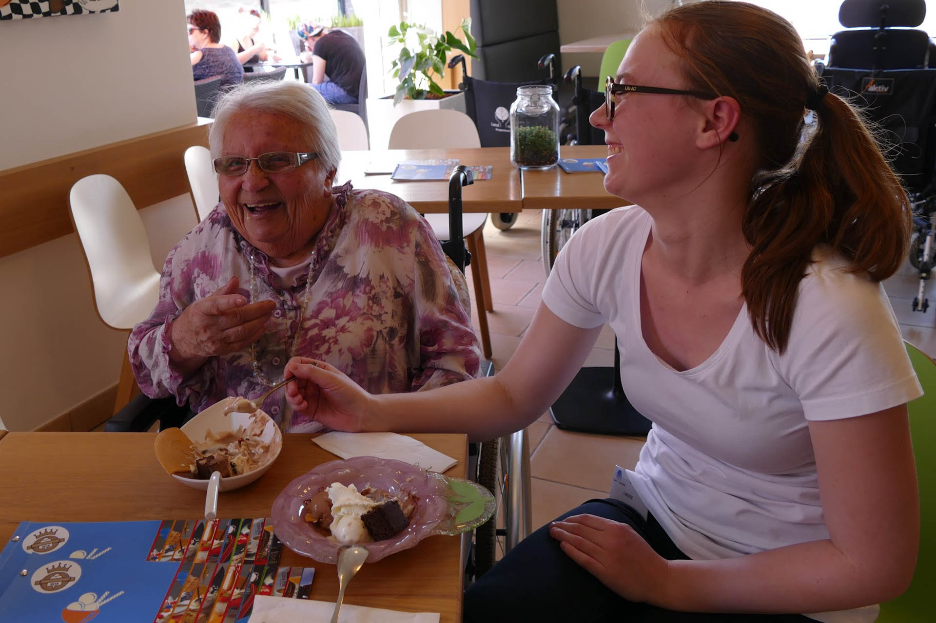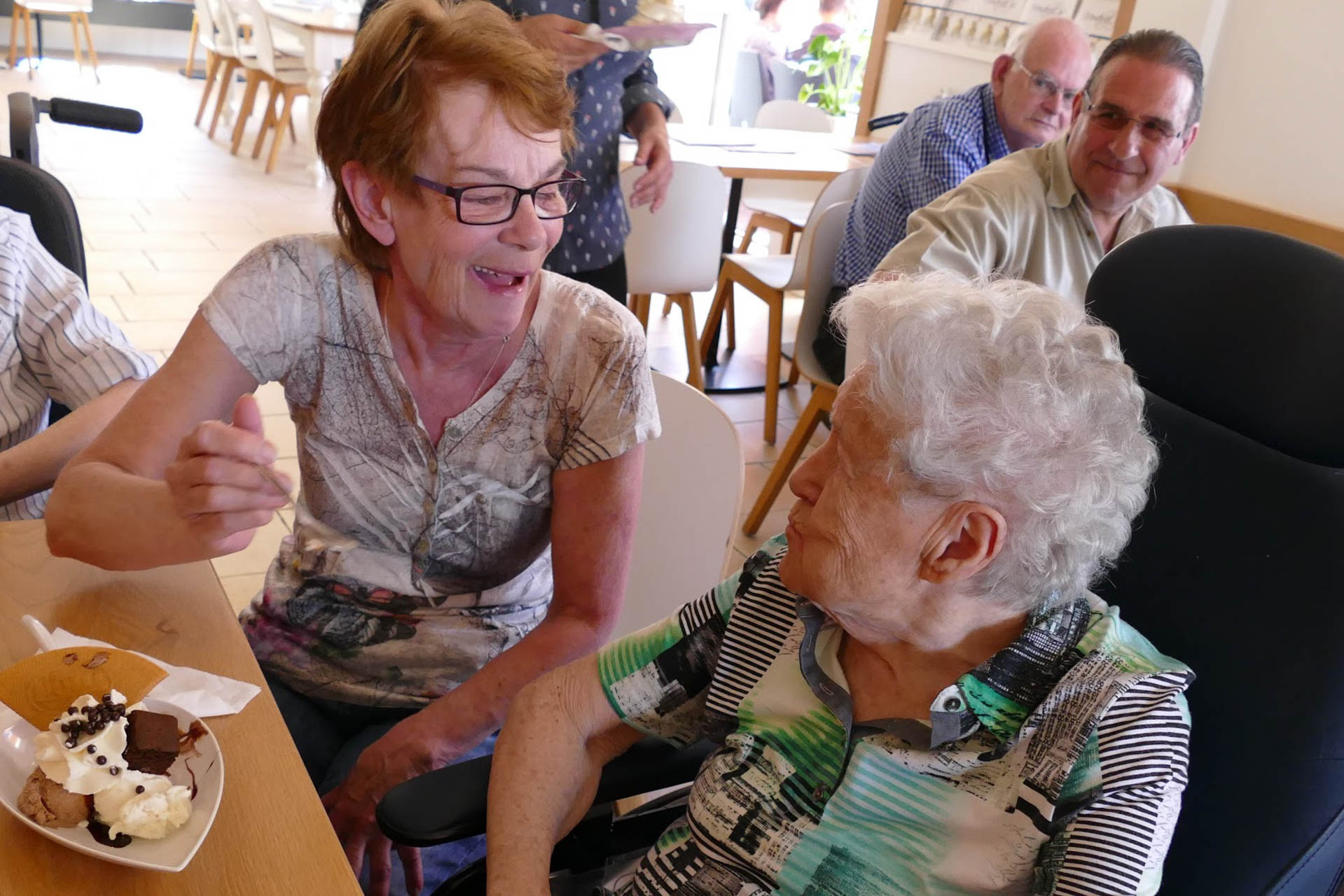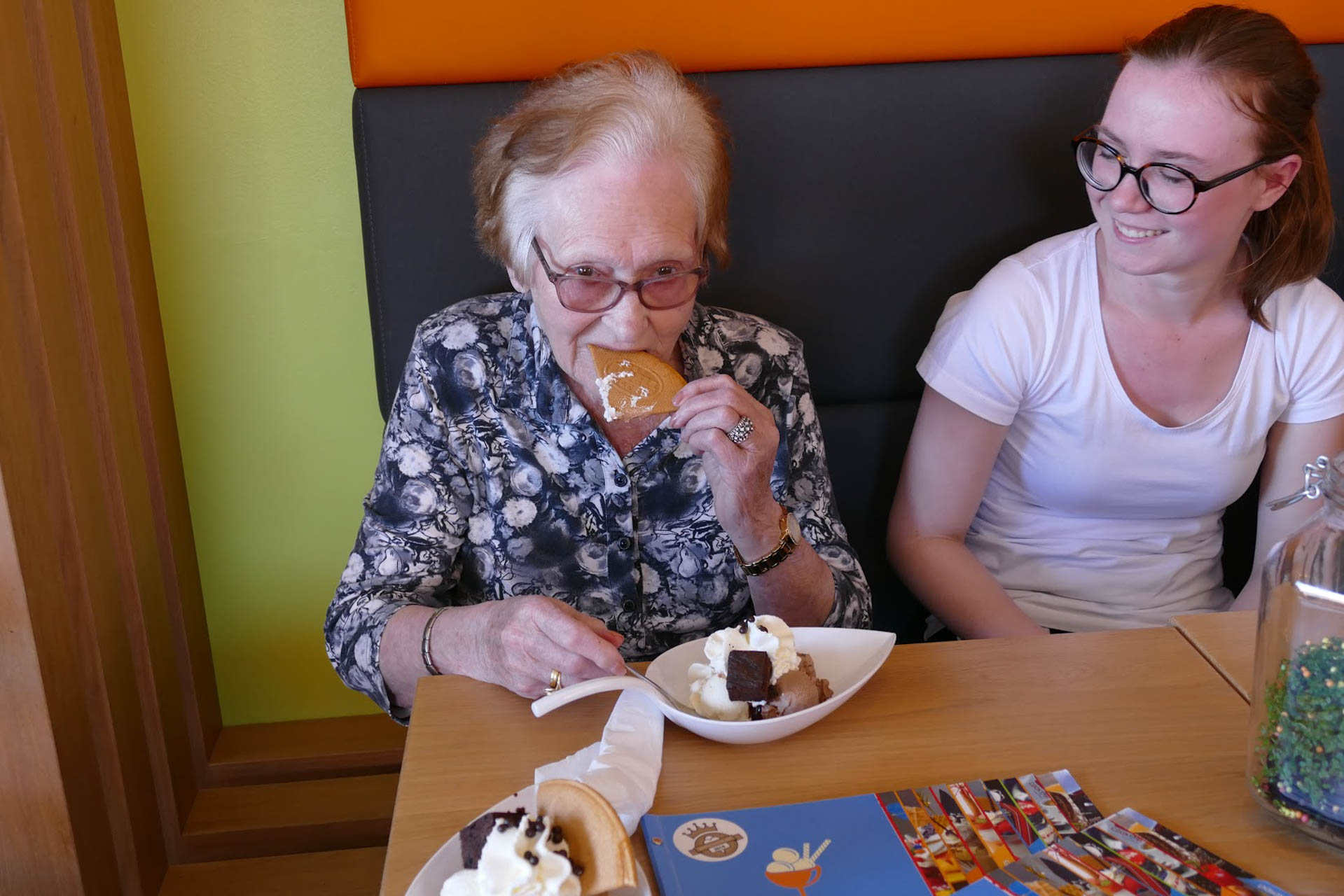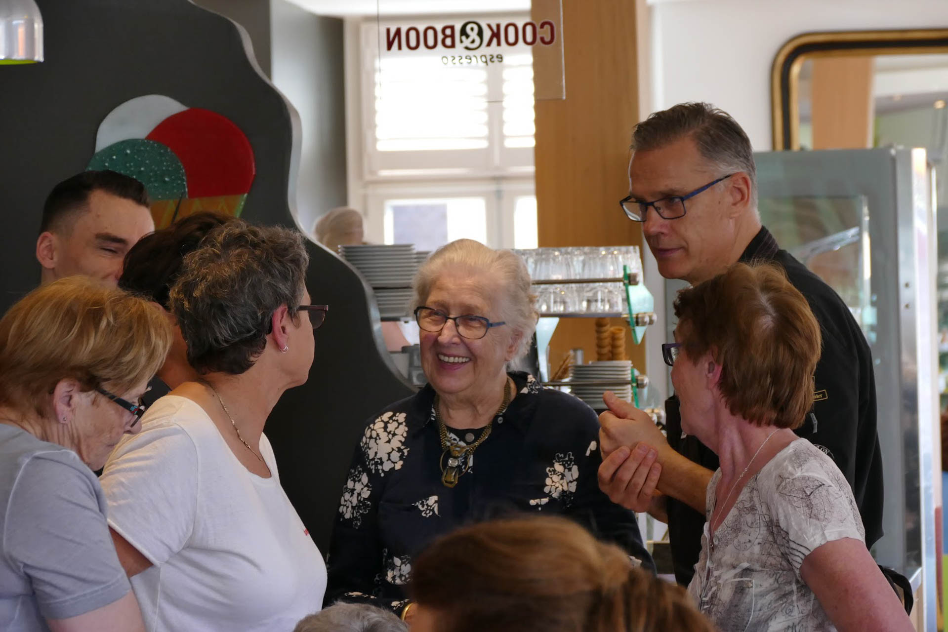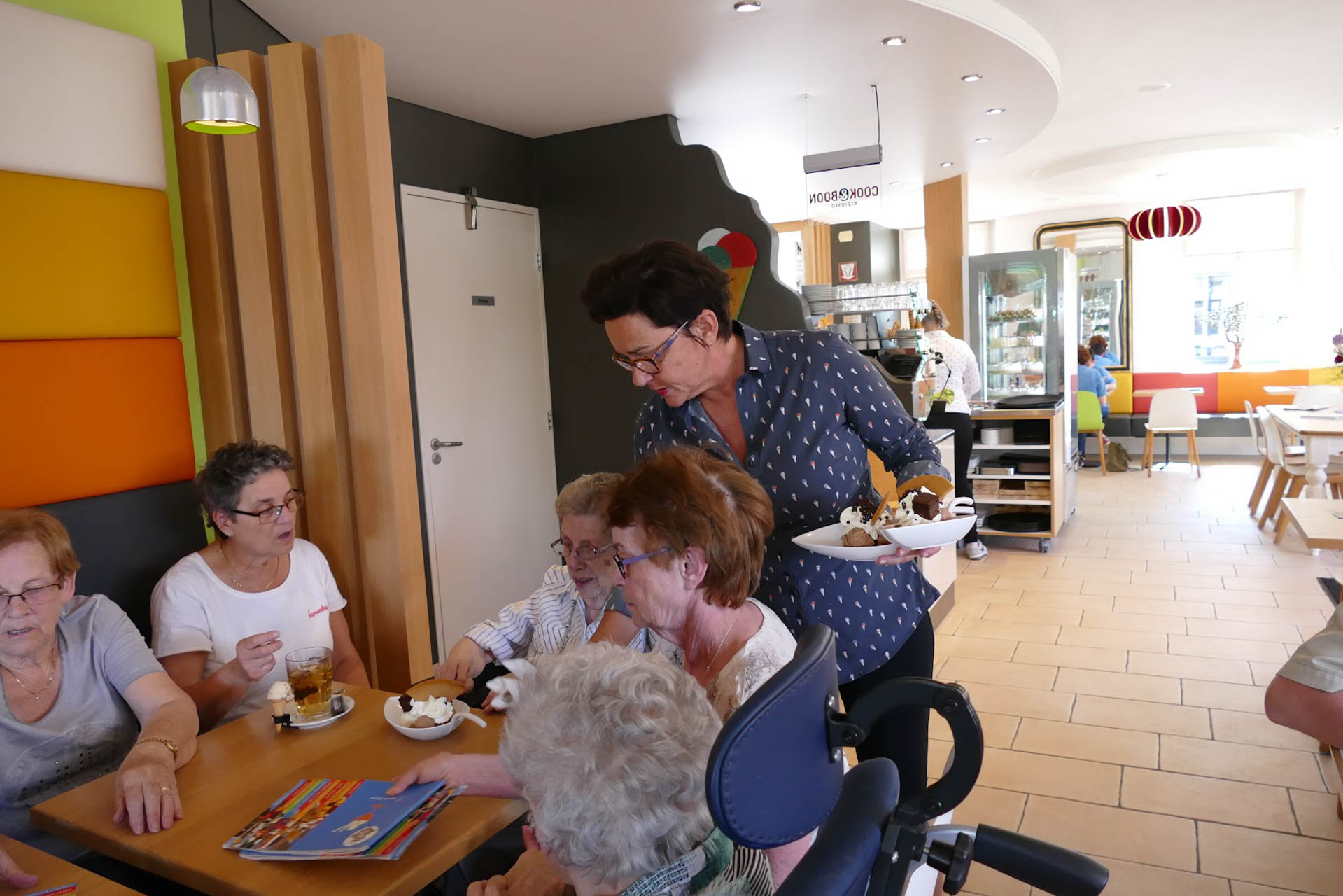 Bewoners van Woning G en H van zorgcentrum St. Joseph, een aantal vrijwilligers en een aantal personeelsleden waren vandaag te gast bij IJssalon Florence in Nederweert.