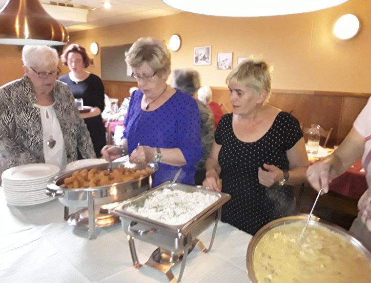 Gisteravond werden de gasten van het Eetpunt heel hartelijk ontvangen door de eigenaresse van Café Zaal Het Vlegelke. De eigenaresse had voor een lekker diner gezorgd van heerlijke champignonsoep, kippenragout, erwtjes en worteltjes, witte koolsalade, rijst en aardappelkroketjes. Het nagerecht was een superlekkere chocolademousse met slagroom en perzik. De gasten gingen weer heel tevreden naar huis.