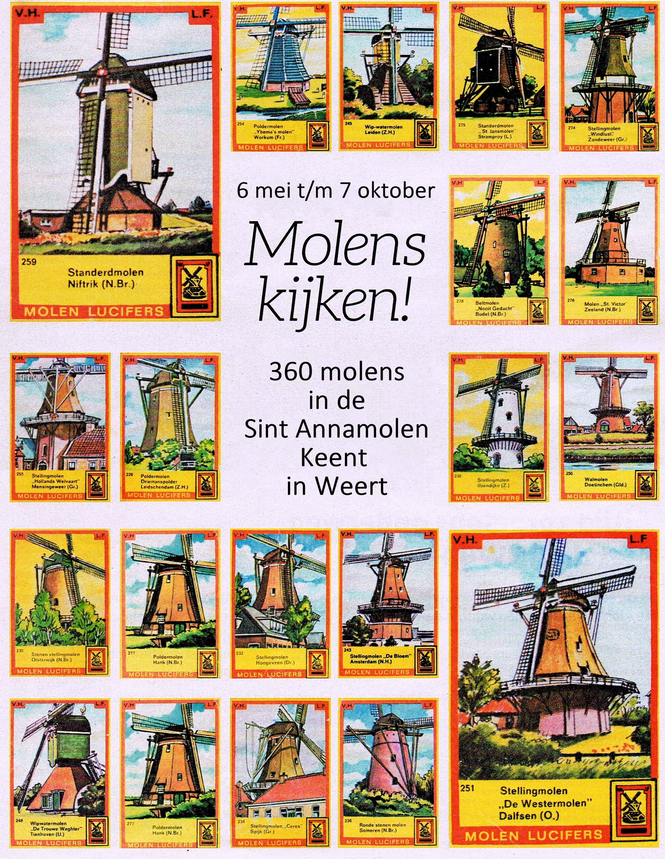 De Molenstichting Weerterland kreeg deze collectie van 360 ontwerpen voor luciferdoosjes met molens uit alle Nederlandse provincies waaronder ook enkele “Weerter” molens en een overzicht van diverse types molens. Deze Molenlucifers werden tussen 1964 en 1979 uitgegeven. De gehele collectie wordt gepresenteerd in tien lijsten die in de ingang van de “invaart” van de molen Sint Anna komen hangen. De opening van de tentoonstelling vindt plaats op zondag 6 mei om 14.00 uur en zal te zien zijn tot en met de Limburgse Molendag op 7 oktober. De Sint Annamolen van Keent ligt aan de Keenterstraat 1 in Weert.