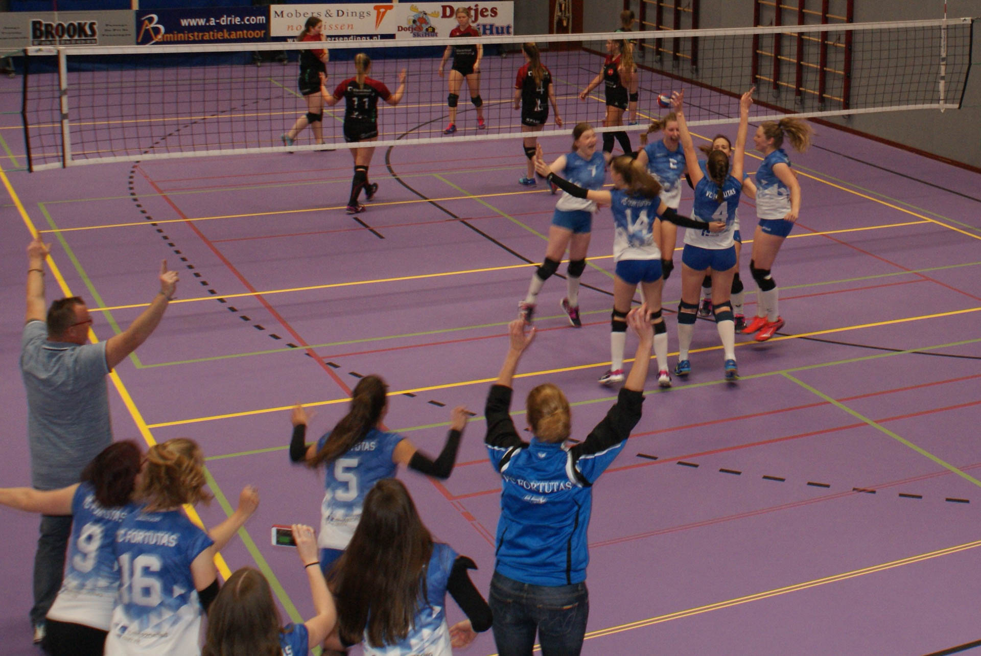 De voorbereidingen liepen, ondanks de blessures, goed en iedereen was op en top gemotiveerd om een goede wedstrijd te spelen. De tribune in Panningen stroomde vol met een enorme grote groep Fortutas supporters, wat een geweldig gezicht was dit. Een enorme steun voor het Fortutas team. De eerste set werd gewonnen met 25-20 door de Fortutas dames en ook in de 2e set speelden de dames een goede wedstrijd. Toch kwam het ervaren Voerendaal goed terug, zij namen hun 1e klasse ervaring mee, maar de Fortutas dames bleven goed spelen door de aanmoedigingen van alle supporters. Ook de 2e set werd met 25-20 gewonnen en nog slechts 1 setwinst was nodig voor de promotie. In de 3e set stoomde de Fortutas dames door. Voerendaal probeerde alles wat er nog kon maar ze maakten geen kans meer. De Fortutas dames speelden erg goed, de coaches Marion en Marco bleven de rust behouden en de Fortutas dames wonnen de set met 25-12 en daarmee was de winst binnen.