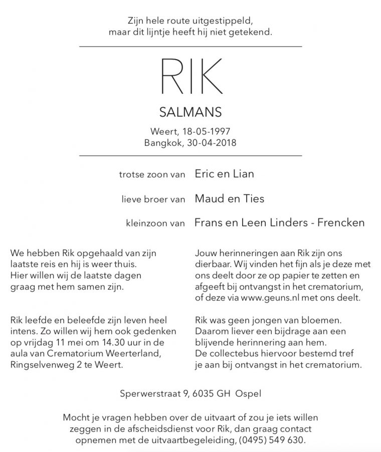 Laat de mooie herinneringen aan Rik een blijvende troost voor jullie zijn. Heel veel sterkte.