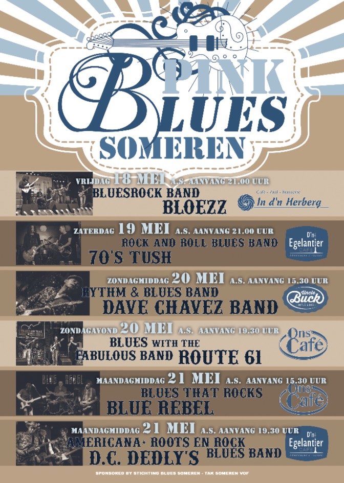 Vanaf vrijdag 18 mei t/m maandag 21 mei wordt weer het jaarlijkse blues festival “ PINKBLUES IN SOMEREN “ georganiseerd door de Stichting Blues Someren en de plaatselijke horeca.