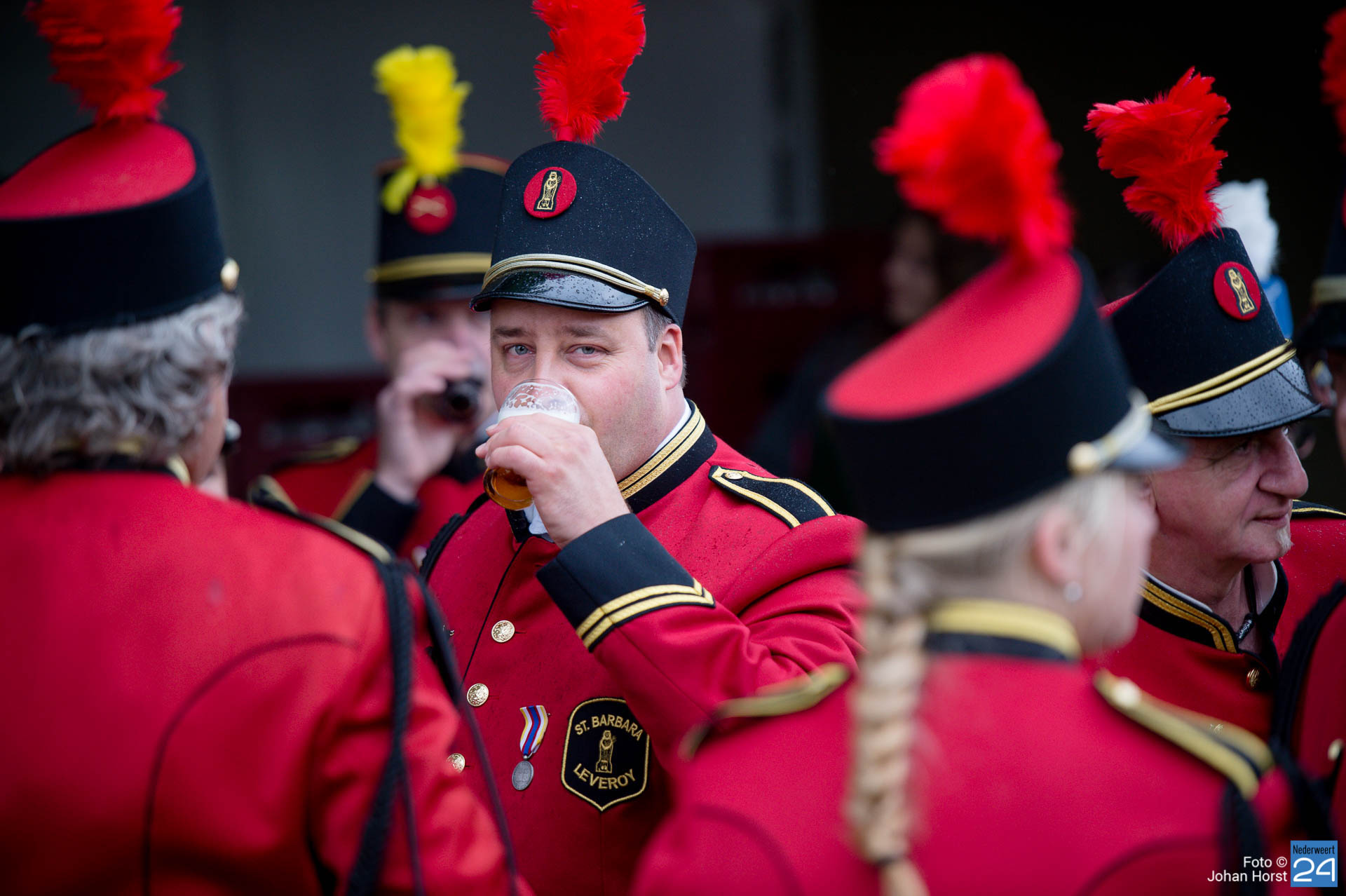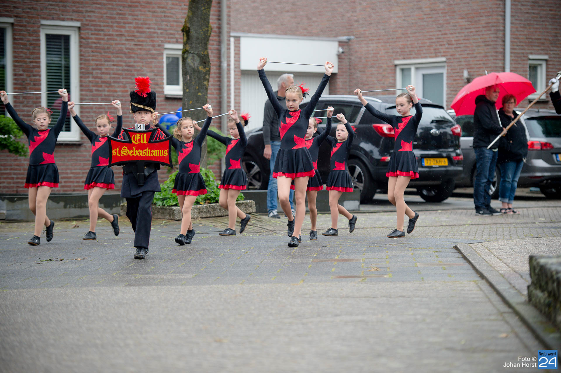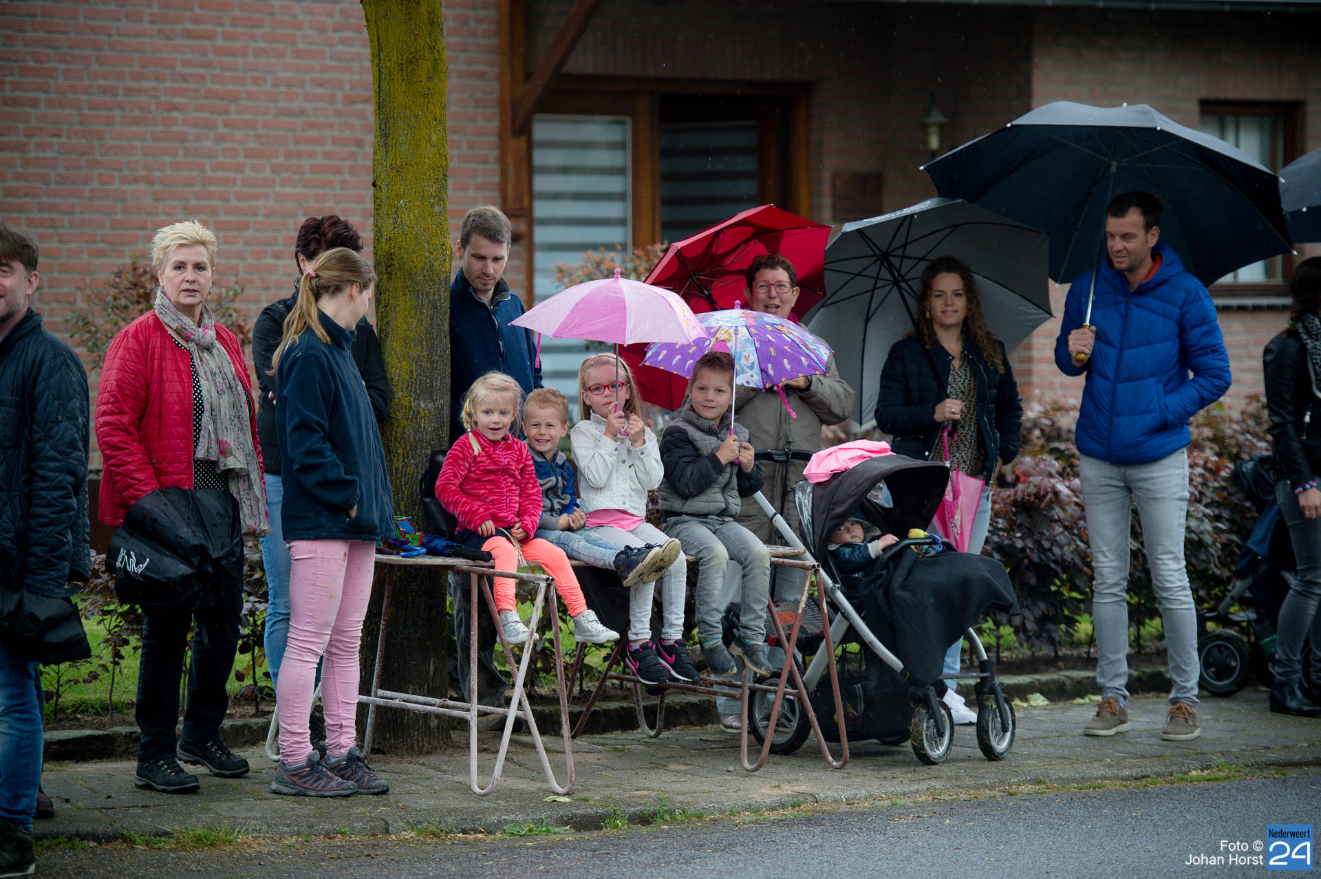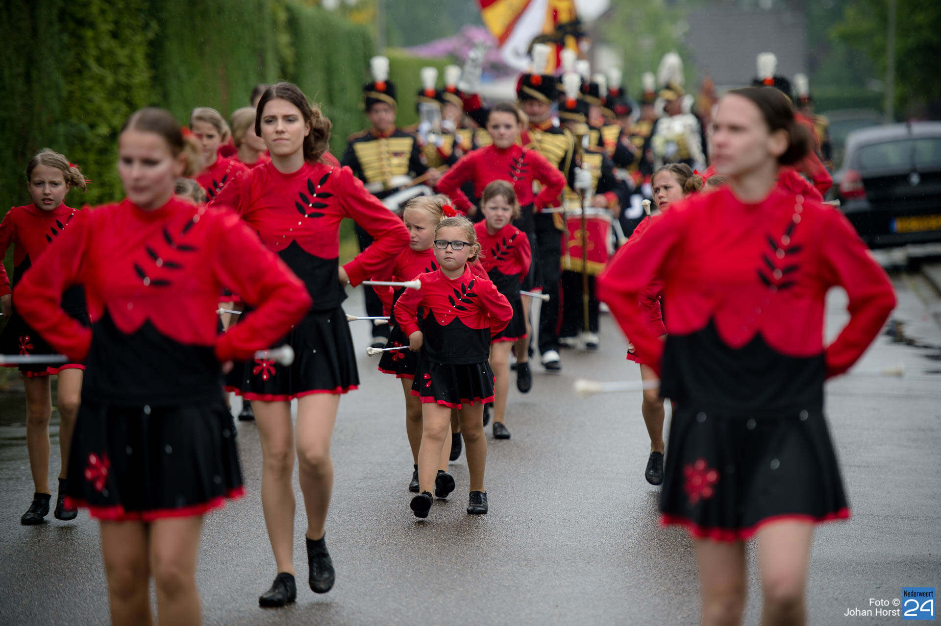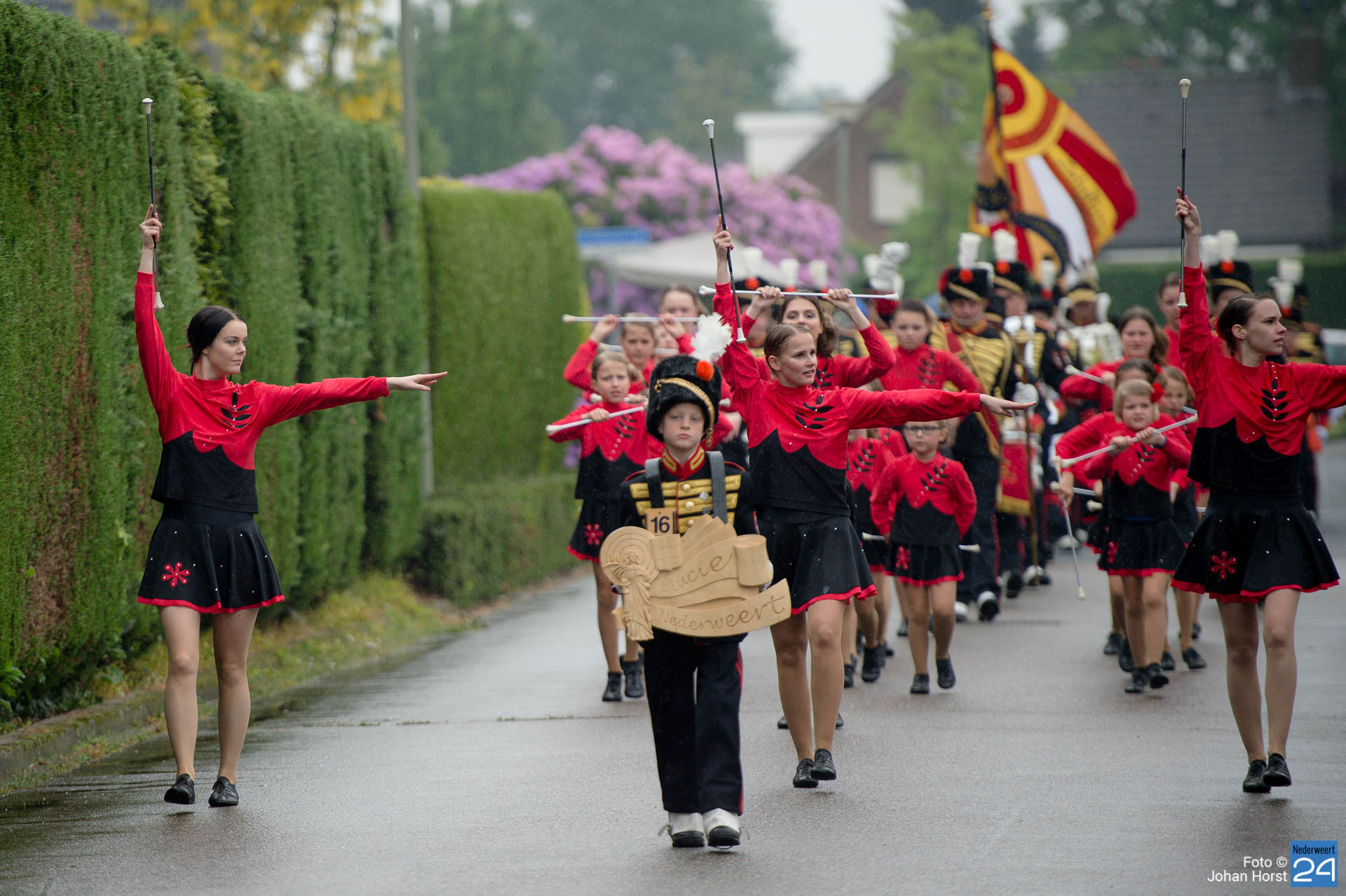 De weergoden lieten zich goed gelden in Baexem. Tijdens de optocht viel de regen met bakken uit de lucht. Het publiek verborg zich onder paraplu’s of ging binnen staan. Desondanks was het een kleurrijk schouwspel. Daarna streden de schutterijen met elkaar onder de schietboom.