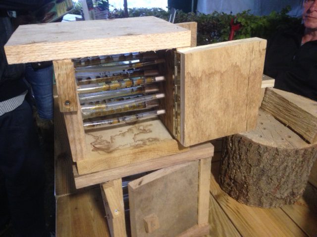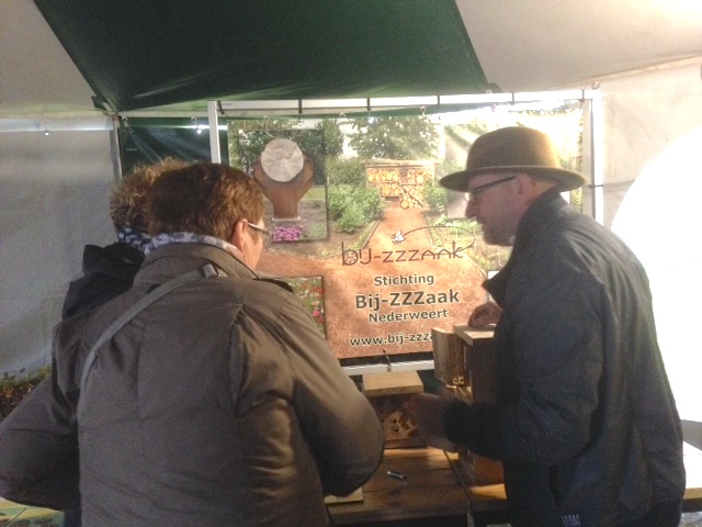 Zondag 29 april stond Stichting Bij-Zzzaak uit Nederweert in het kader van Loeren bij de Boeren bij melkveehouderij Hoeve Lieshout te Weert/Swartbroek. Bezoekers kijken geïnteresseerd in de observatiekast waar doorzichtige buisjes verbonden zijn met de invlieggaatjes. Men kan zien hoe de solitaire bij eerst stuifmeel achter in de “gang”stopt. Dan een eitje legt en de cel afdicht met een papje van modder, plantenresten en speeksel. Zo komen er meerdere cellen in een “gang”. De “lengte van de “gang” is ongeveer 20 cm. De eitjes worden larve en deze larven vliegen volgend voorjaar uit als jonge solitaire bij.