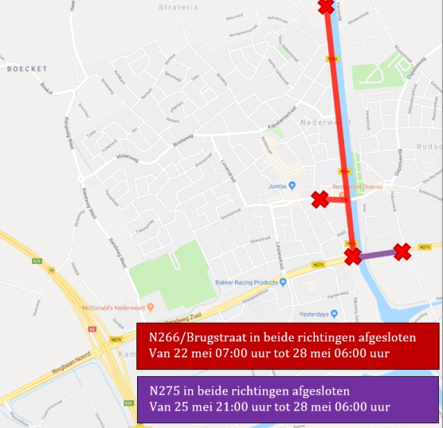 Op 22 mei starten de werkzaamheden voor het omdraaien van de rijrichting in de Brugstraat. Het werk wordt gecombineerd met onderhoud aan de N266. Aansluitend vinden onderhoudswerkzaamheden plaats aan de N275. Houdt rekening met afsluitingen, omleidingen en enige vertraging
