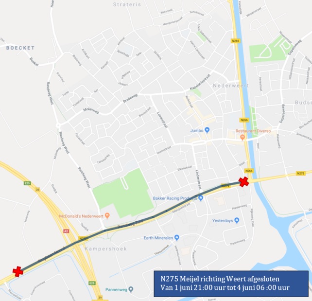 In fase 2 wordt de N275 vanaf Meijel richting Weert deels afgesloten. Deze fase duurt van vrijdag 1 juni 21:00 uur t/m maandagochtend 4 juni 06:00 uur.