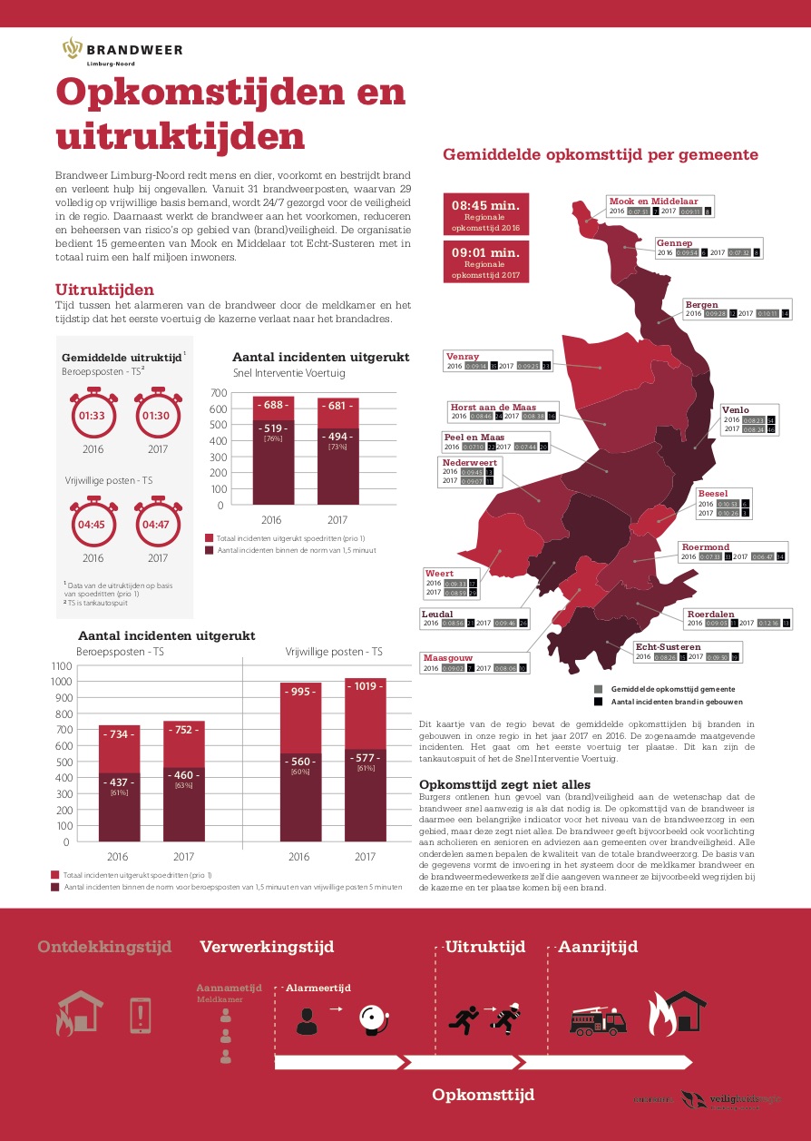 Eén van de manieren om de prestaties van de brandweer te meten, is door te kijken naar opkomst- en uitruktijden. De vrijwilligers en de beroepsploegen van Brandweer Limburg-Noord rukken snel en naar verwachting uit. De vrijwilligers binnen 5 minuten, de beroepsploegen hebben gemiddeld net iets meer dan 1,5 minuut nodig om van de kazerne te vertrekken. Brandweer Limburg-Noord was in 2017 gemiddeld in ongeveer 9 minuten bij een brand in een gebouw. Daarmee presteert Brandweer Limburg-Noord, gezien de uitgestrektheid van de regio en beschikbare mensen en middelen, naar verwachting en in lijn met de tijden van de afgelopen jaren.