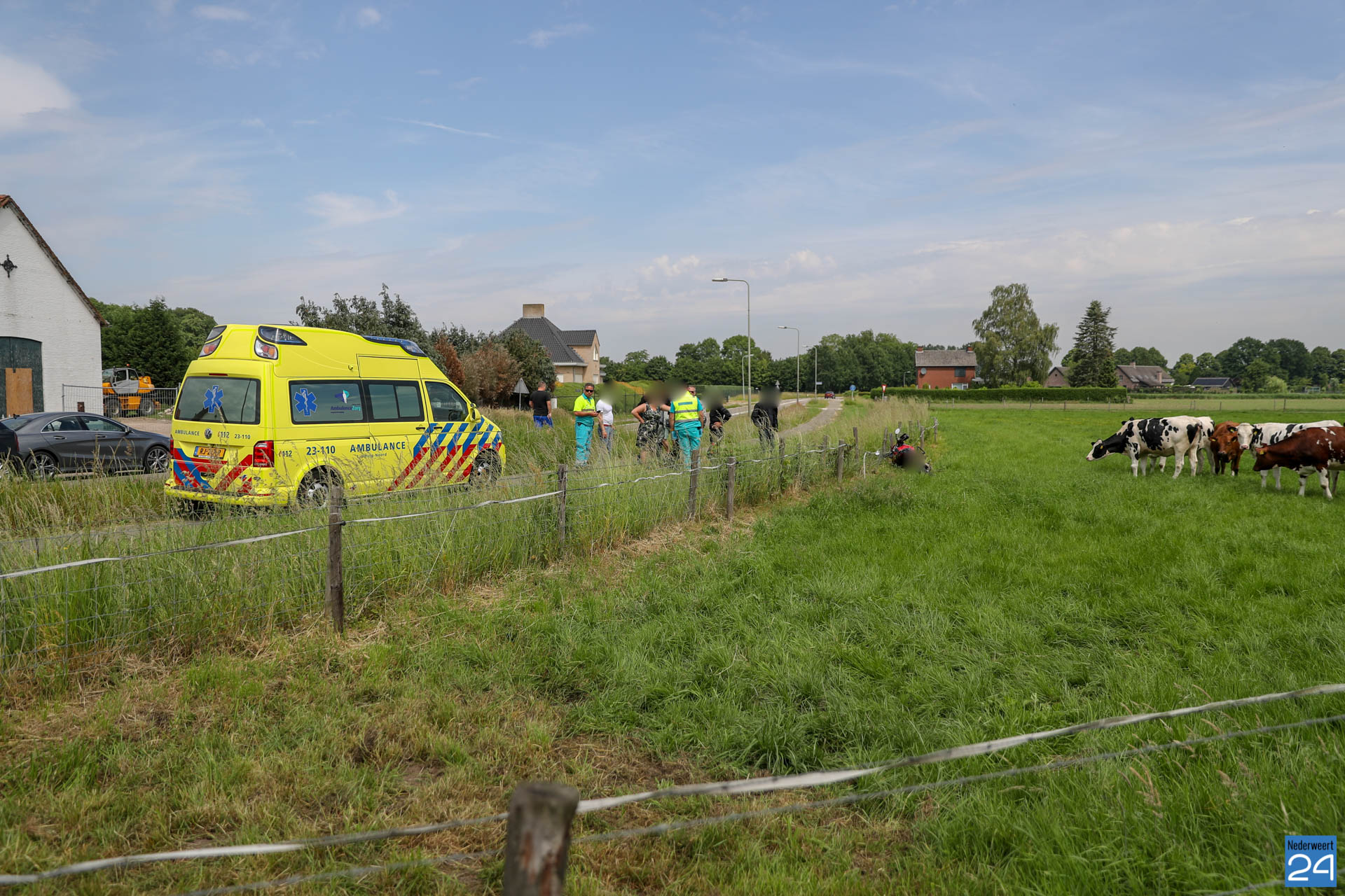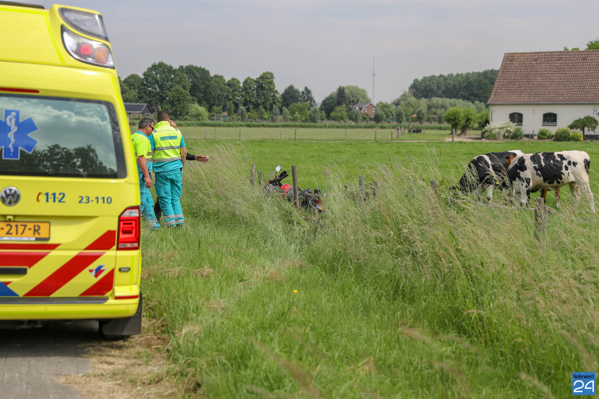 Motorrijder belandt tussen de koeien