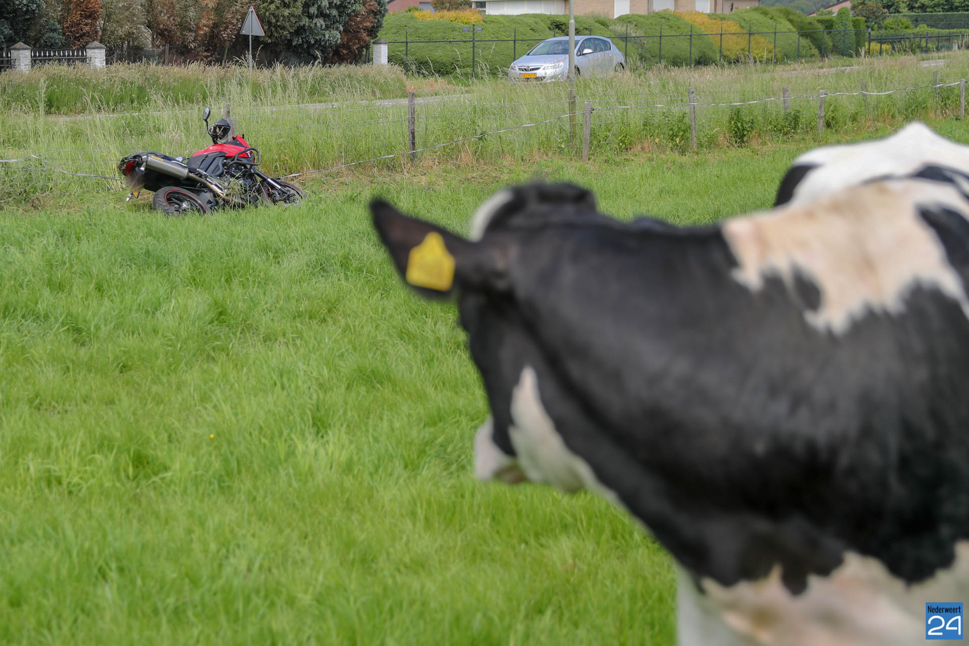 Zondagmiddag is een motorrijder op de Kelperweg in botsing gekomen met een tegemoetkomende personenauto. Hierdoor verloor hij de macht over het stuur en belandde in een weiland tussen de koeien.