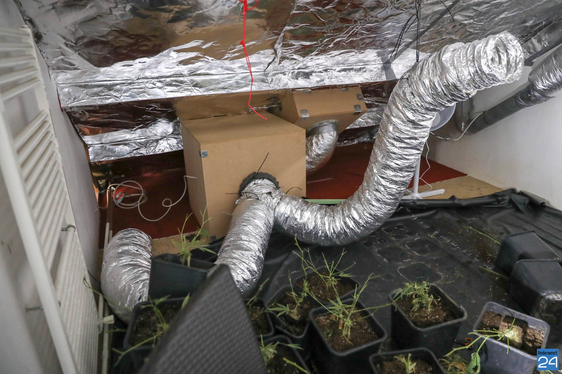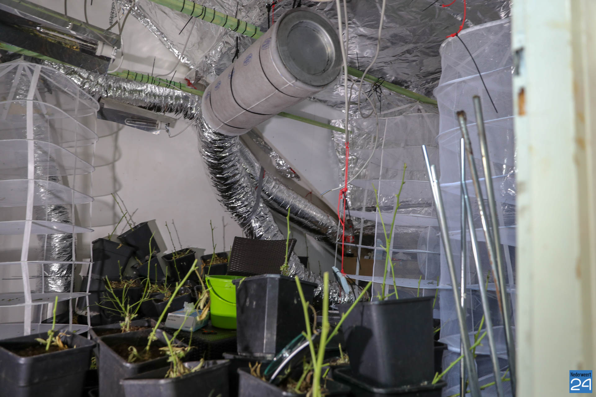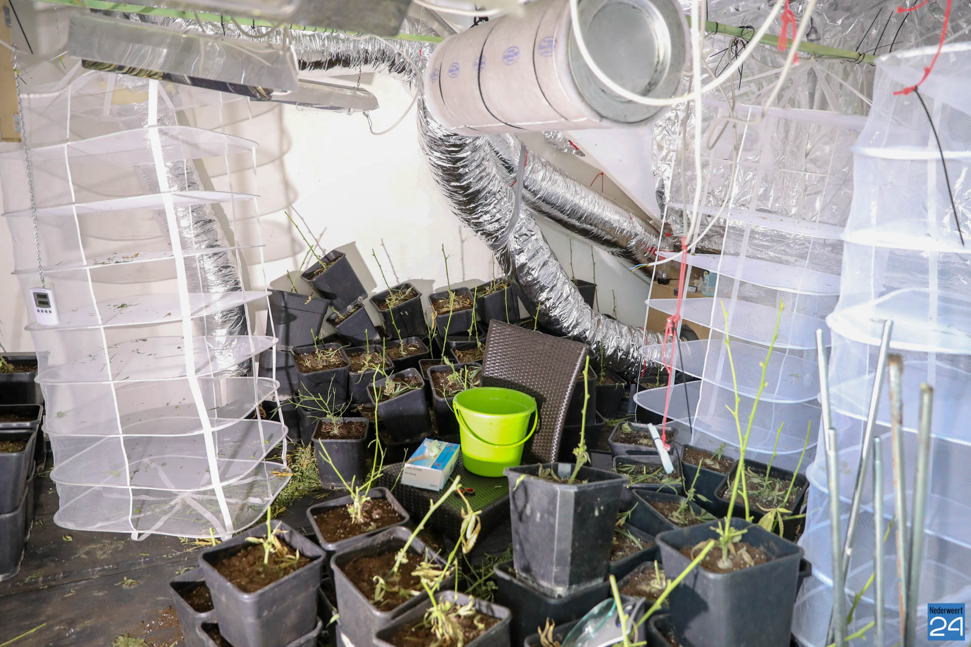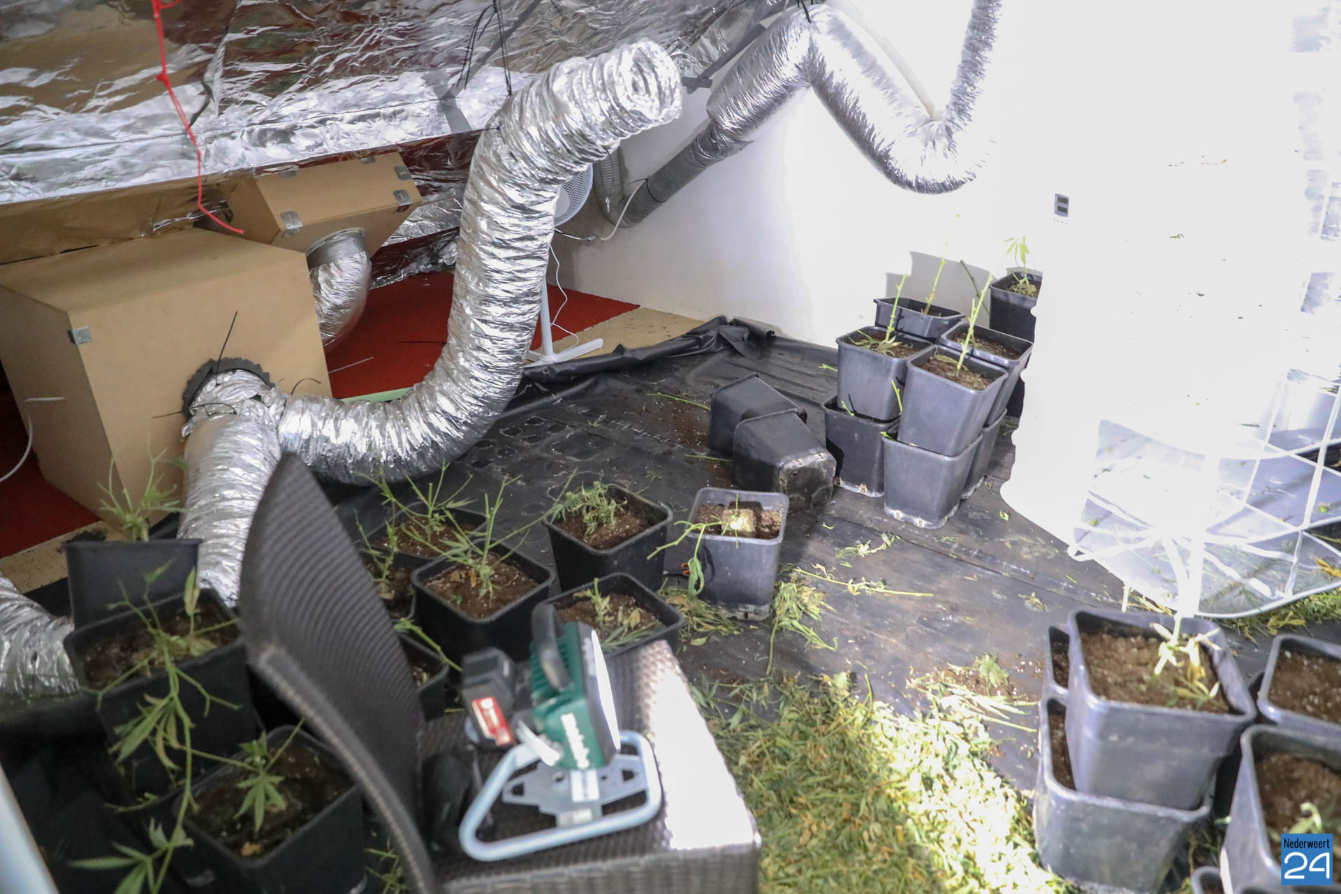 De politie was de kwekerij naar aanleiding van tips op het spoor gekomen. In de tussenwoning troffen ze op de zolder een ravage aan. De planten waren geknipt en lagen te drogen. De potten waren op een hoop gegooid.