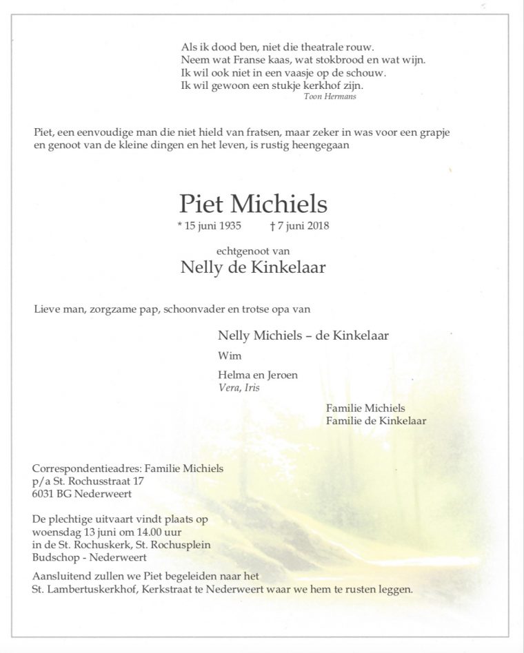 Familie Michiels, heel veel sterkte met het overlijden van Piet