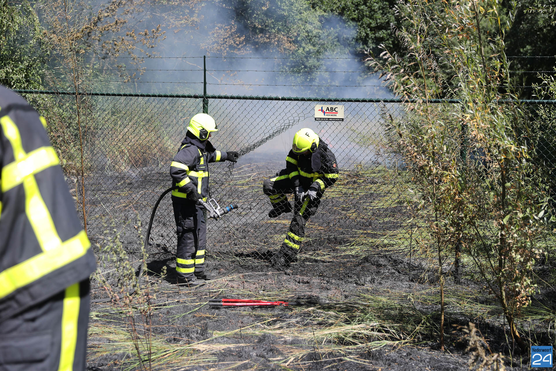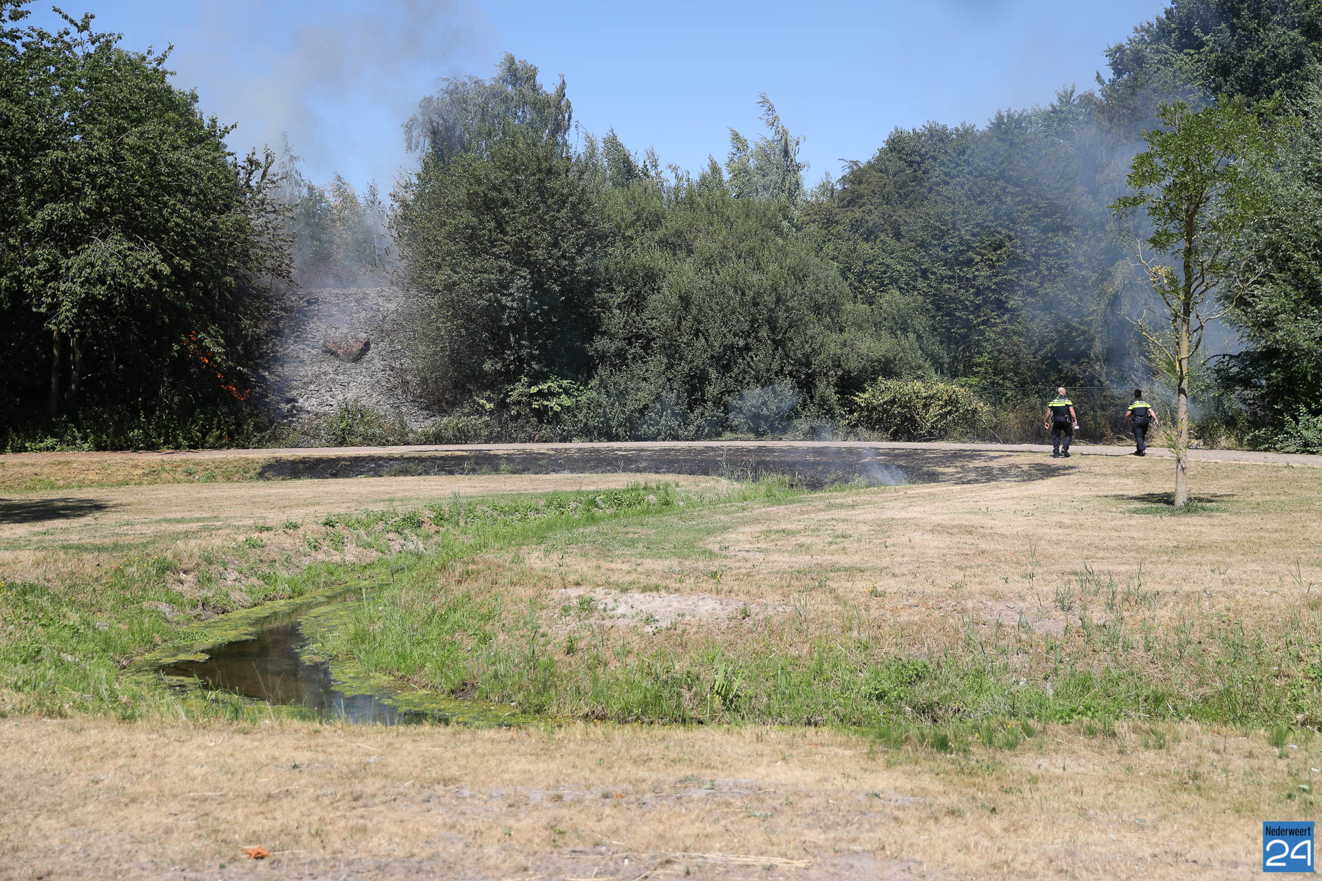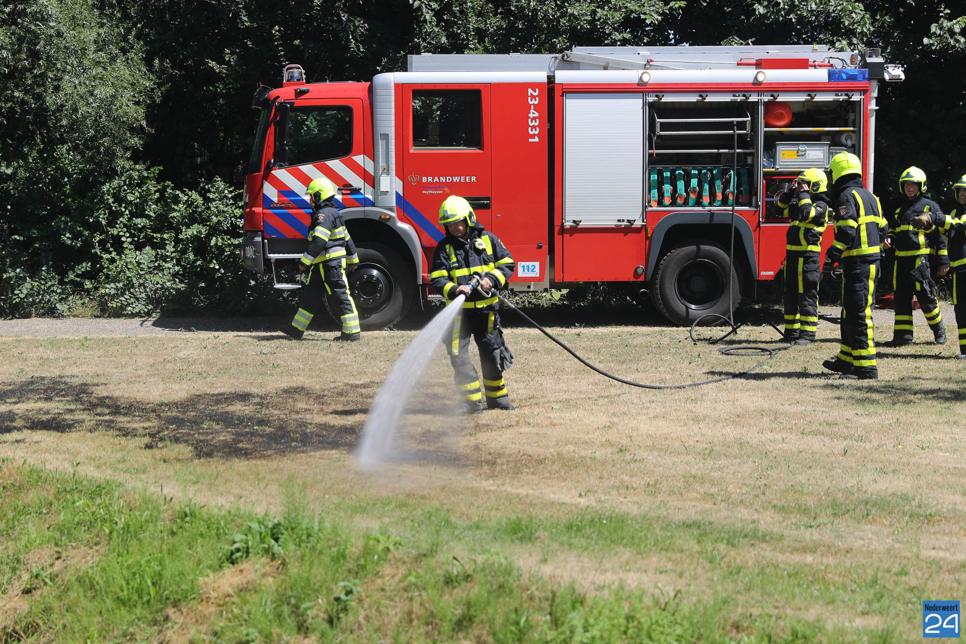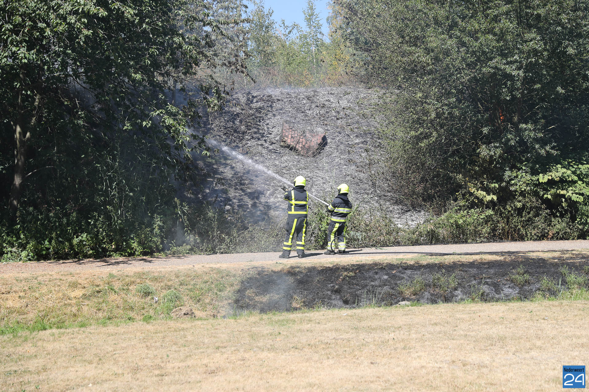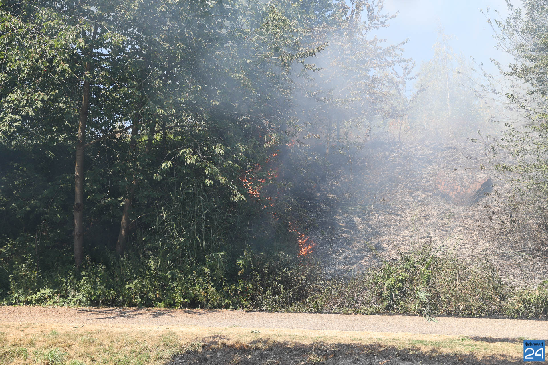 De brandweer van Heythuysen en Grathem werden opgeroepen omdat de brandweervrijwilligers van Weert al bij de grote natuurbrand in de Boshoverheide aan de slag waren. Ongeveer 1000 m² berm en grasvlakte zijn in vlammen opgegaan.