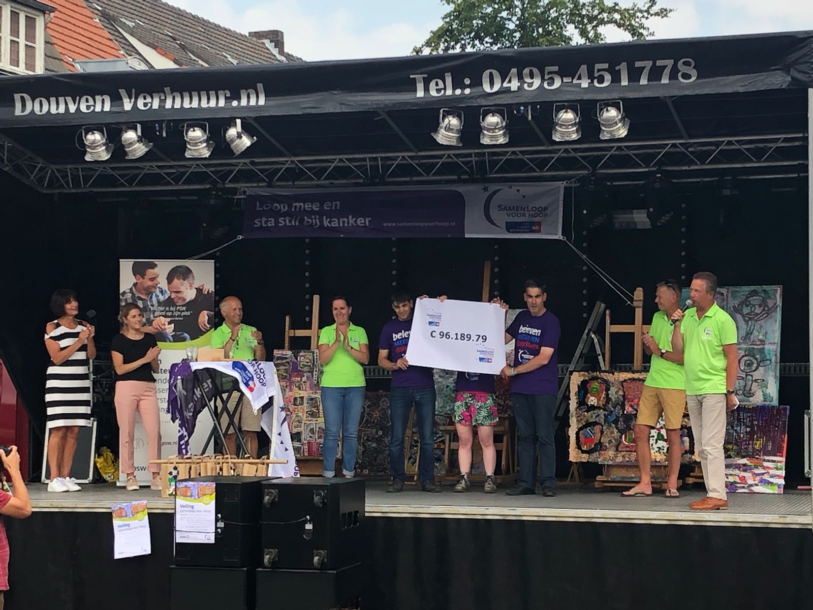 De eindstand van de SamenLoop voor Hoop Weert 2018 is vrijdagmiddag tijdens de braderie in Weert bekend gemaakt. Het uiteindelijke bedrag is € 96.189,79 geworden. Dat is fors meer dan de € 78.763,= die tijdens de Samenloop zelf op 3 juni als voorlopige eindstand bekend werd gemaakt. De dagen na het geweldige weekend bij Park Aan de Bron kwamen nog vele opbrengsten van teams en donaties binnen die uiteindelijk voor dit spectaculaire eindbedrag hebben gezorgd. Tijdens de braderie vond de laatste actie plaats, een veiling van kunstwerken van PSW, gastheer van deze SamenLoop.