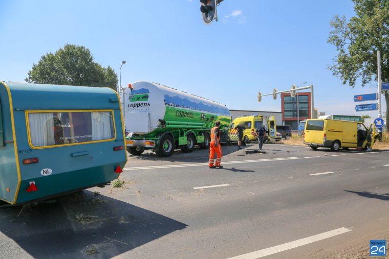Een vrachtwagen en een busje met caravan zijn vrijdagochtend met elkaar in botsing gekomen. Dat gebeurde op de kruising N275 met de op en afrit van de A2 Nederweert. Volgens een chauffeur die het ongeluk zag gebeuren blokkeerde de remmen van de bestelbus. Deze zou zijn gaan slingeren en knalde vervolgens tegen de vrachtwagen aan.
